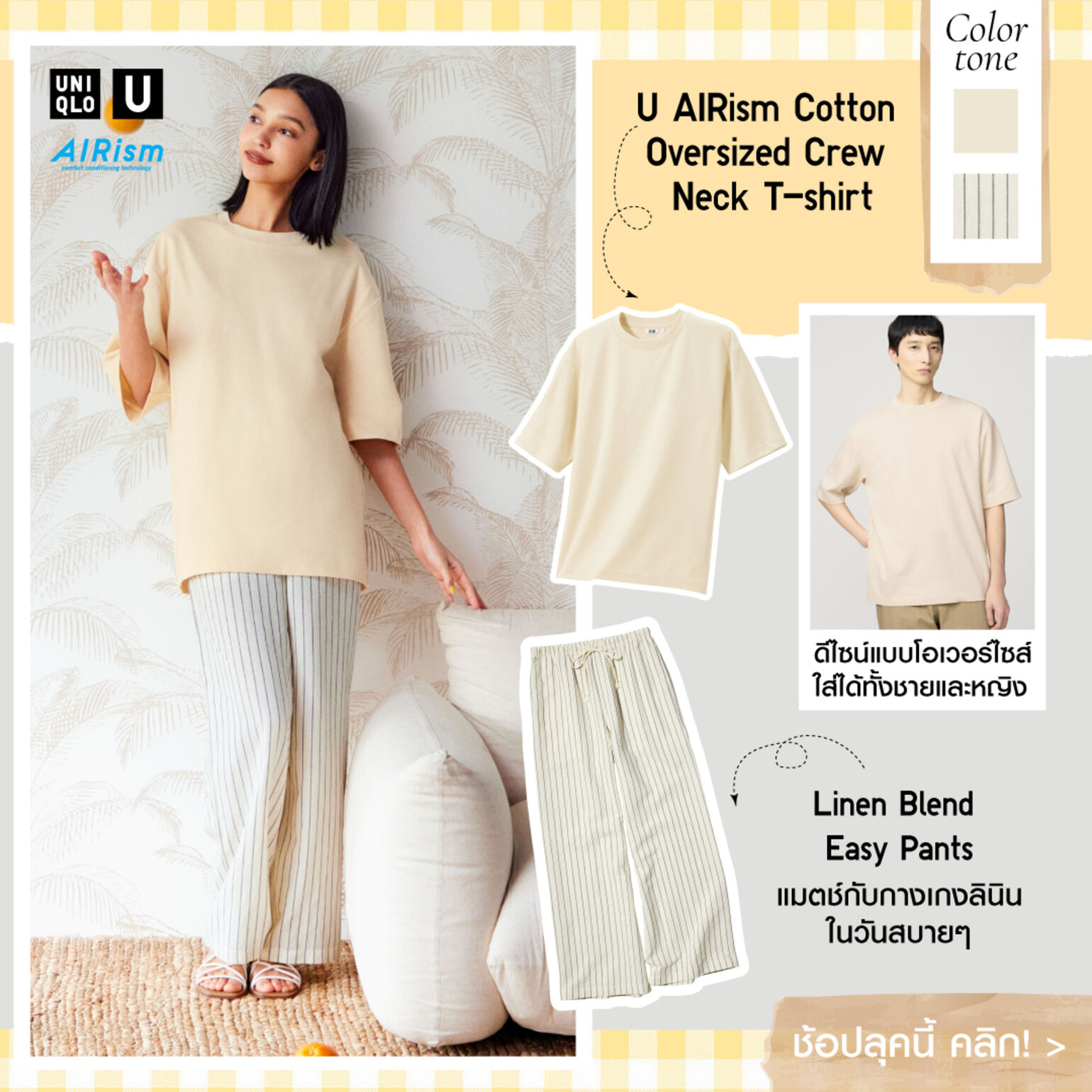 เสื้อยืด AIRism คอตตอน - U AIRism Cotton Oversized Crew Neck T-shirt ตัวนี้คือสุดยอดแห่งความสบาย ด้วยเทคโนโลยีที่ระบายอากาศและสัมผัสนุ่มแบบผ้าคอตตอน ทรงโอเวอร์ไซส์ ในโทน Butter Yellow ช่วยให้ลุคดูชิคและทันสมัย จับคู่กับกางเกงผ้าลินิน Linen Blend Easy Pants หรือจะใส่กับกางเกงยีนส์และรองเท้าผ้าใบ ก็เหมาะกับวันชิลๆ อยู่บ้าน หรือไปคาเฟ่ก็ได้เหมือนกัน
