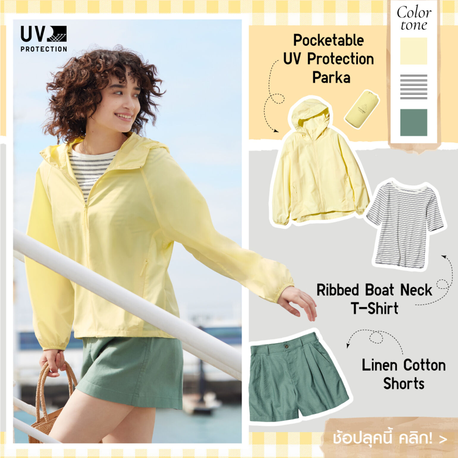 เสื้อฮู้ดพาร์กา Pocketable UV Protection Parka ตัวนี้เป็นไอเทมที่ทั้งเบาและพกพาง่าย มาพร้อมเทคโนโลยี UV Protection ช่วยปกป้องผิวจากรังสียูวีถึง 90% เหมาะสุดๆ กับแดดแรงของหน้าร้อนเมืองไทย สี Butter Yellow ช่วยให้ลุคดูซอฟต์แต่ยังคงความสปอร์ตเก๋ สวมทับเสื้อยืด กับกางเกงขาสั้น เพื่อลุคซัมเมอร์สุดชิล