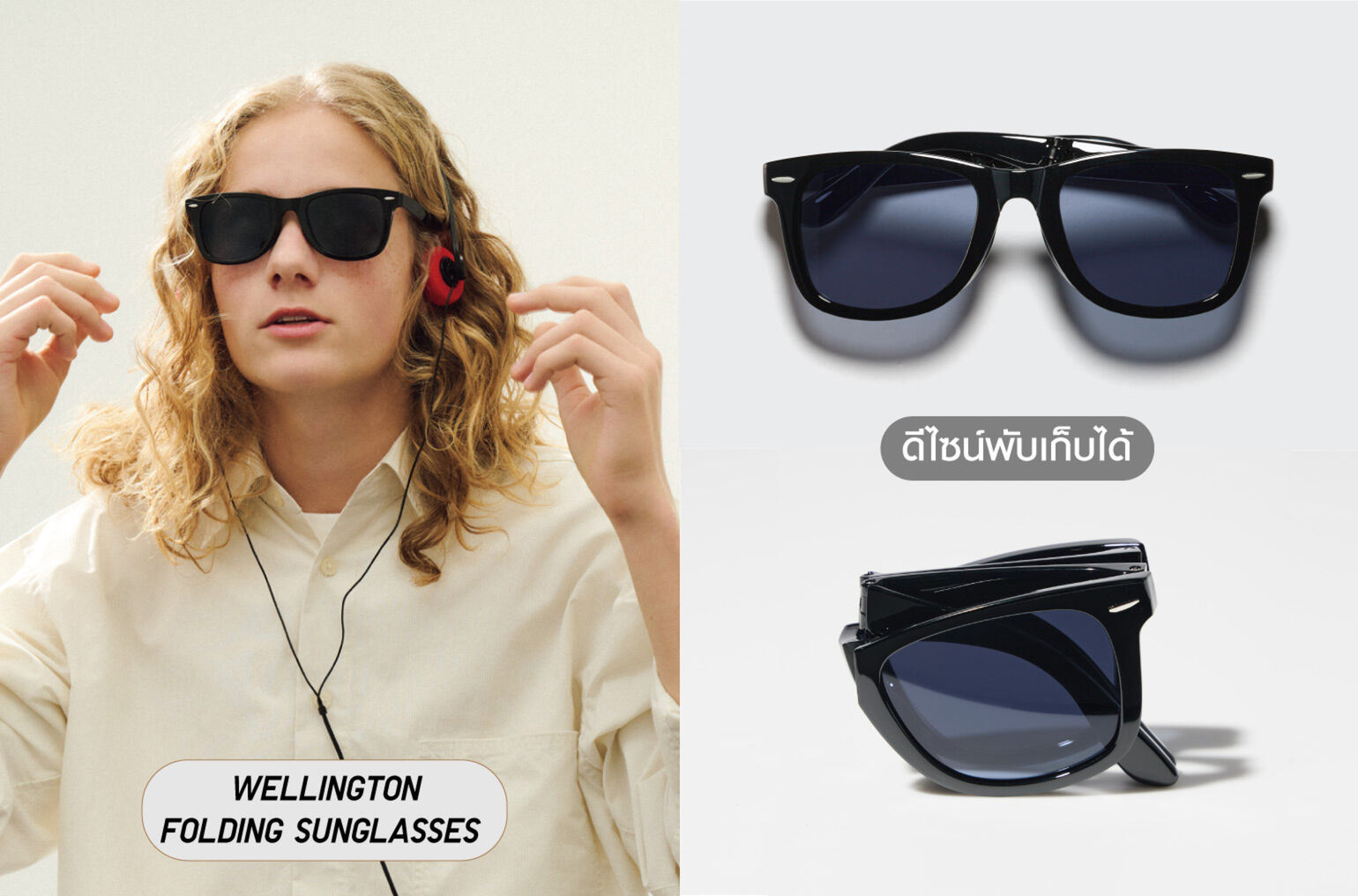 - Wellington Folding Sunglasses สีดำคลาสสิก ใส่แล้วช่วยเสริมลุคทำงานที่ลงตัว ด้วยดีไซน์แบบพับได้ สามารถพกไปทำงานได้ทุกวัน