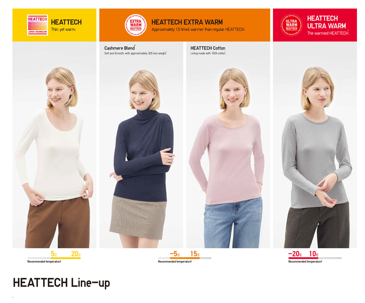 ฮีทเทค (HEATTECH) คือนวัตกรรมเฉพาะจากยูนิโคล่ที่เนื้อผ้าออกแบบมาเพื่อสร้างความร้อนจากร่างกายและเปลี่ยนให้เป็นพลังงานความอุ่นจากโมเลกุลของน้ำที่ปล่อยออกมาจากร่างกาย และด้วยเนื้อผ้าที่บางเบา แต่ช่วยกันหนาวได้ดี จึงตอบโจทย์นักเดินทางที่ไม่อยากแบกสัมภาระหนัก สามารถพับเก็บได้โดยไม่กินเนื้อที่กระเป๋า