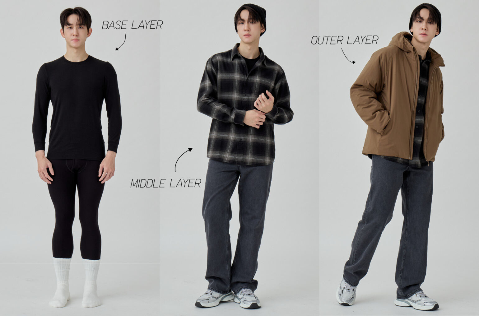 • ชั้นในสุด: ใส่เสื้อฮีทเทค หรือกางเกงลองจอน เพื่อกักเก็บความร้อน