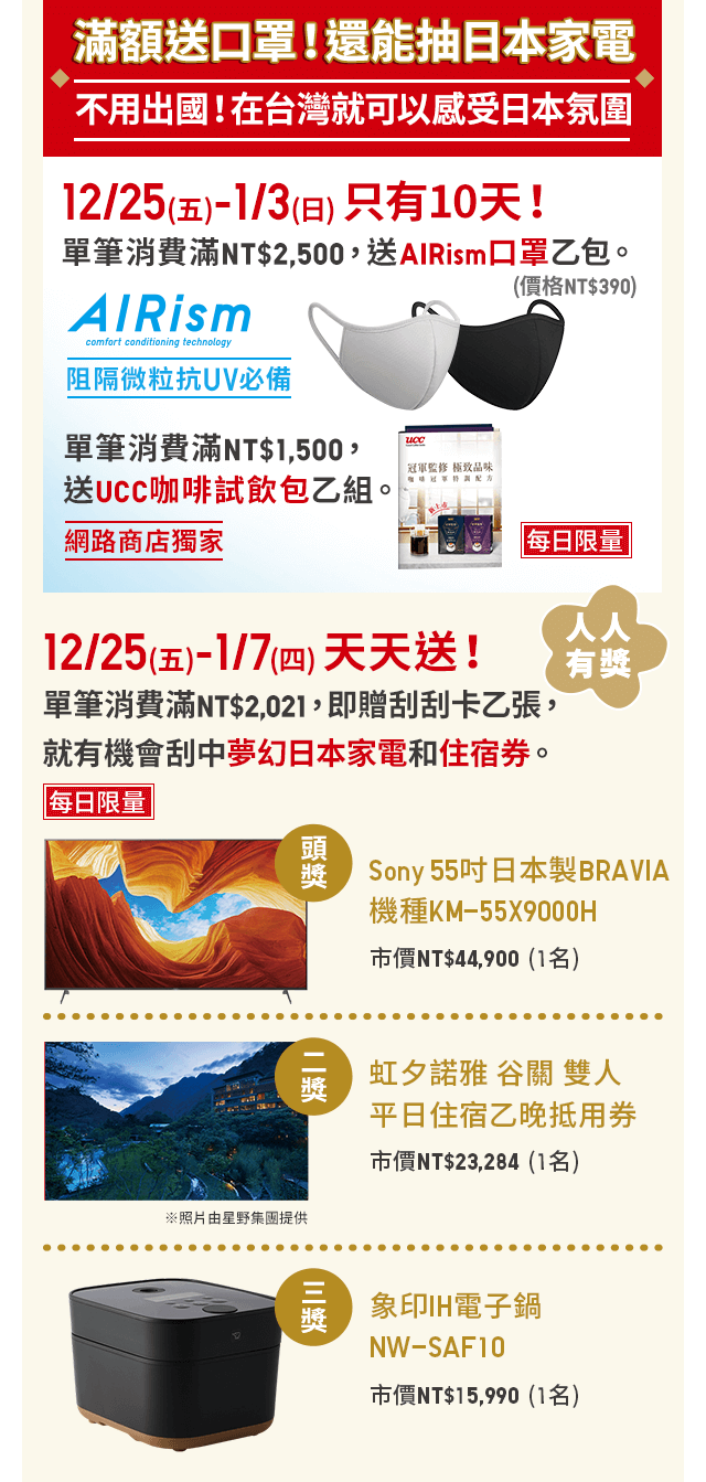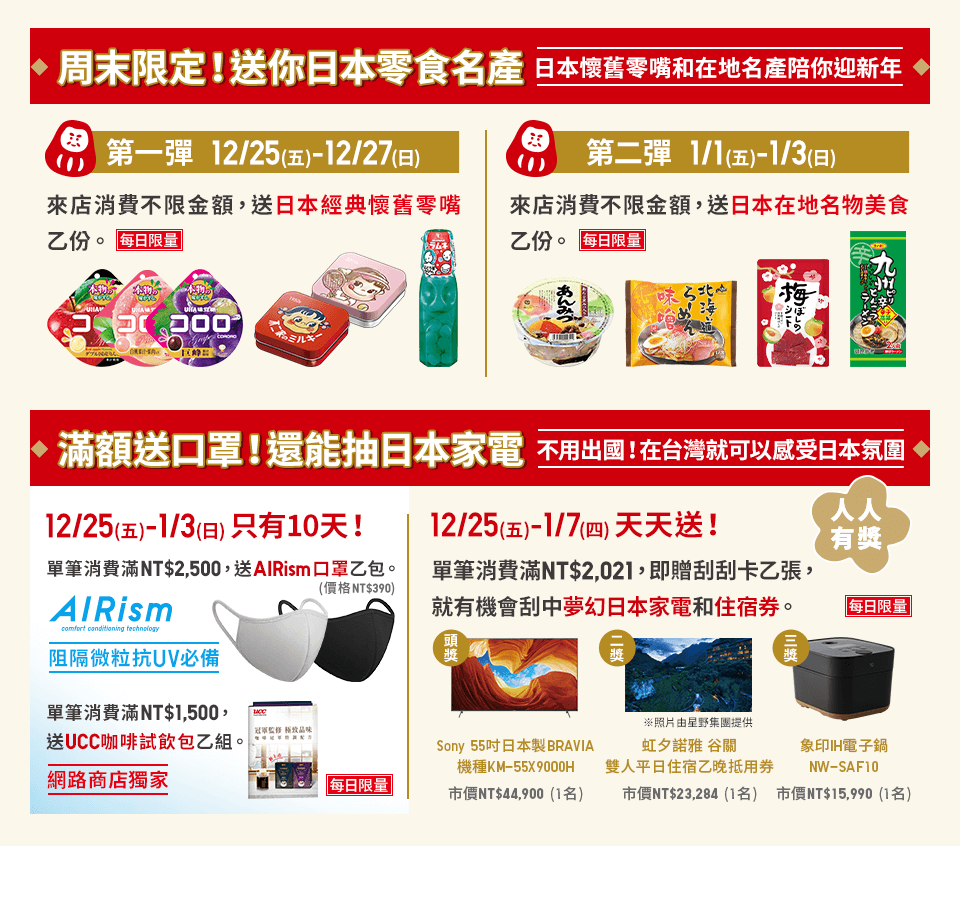 UNIQLO 歲末新年祭自2021年12/24(五)至01/06(四)連續14天,全台店舖及網路商店同慶,超過千款商品NT$99元起!明星主打商品期間限定優惠,男女童嬰幼兒皆有精選商品新價格優惠!天天來店消費贈卡片,滿額再贈獨家好禮,立即選購現買現穿!首下載或首次更新UQ APP即可獲得NT$80元新平台滿額首購金;生日券於當日完成登錄生日資訊者,即可點選UNIQLO APP至我的帳戶查看「優惠券」領取使用。快來下載最新APP會員或訂閱UNIQLO電子報會員,隨時掌握最新優惠訊息唷!