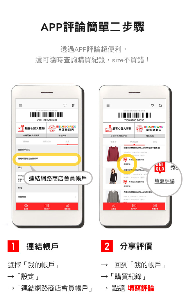 - 參與辦法②之參加者,需將UNIQLO APP會員綁定網路商店會員帳號,方可參加活動抽獎。