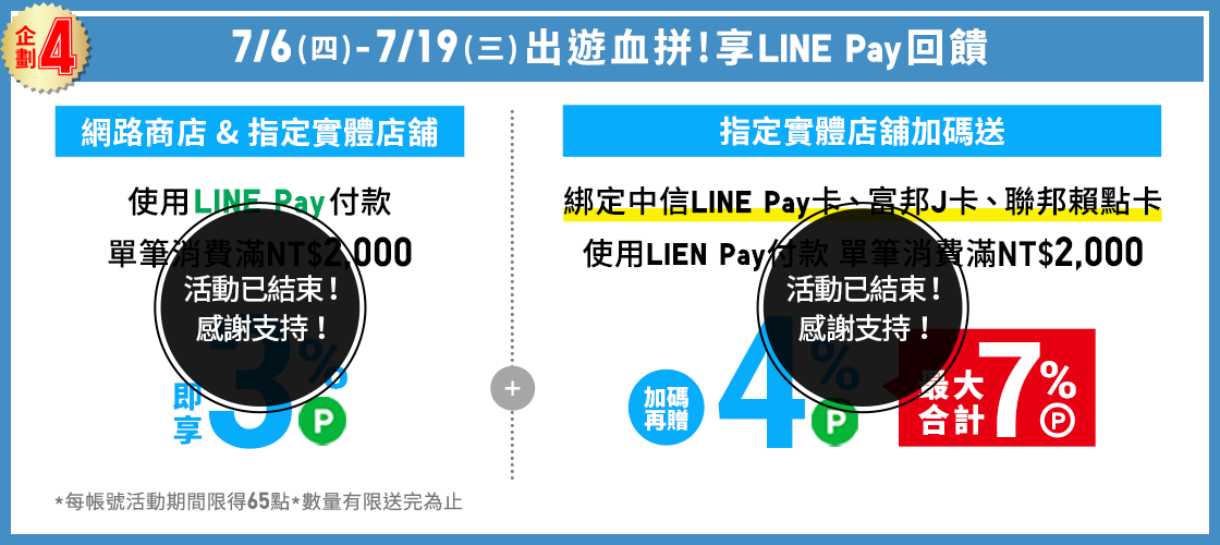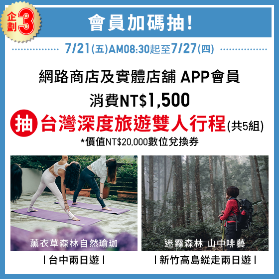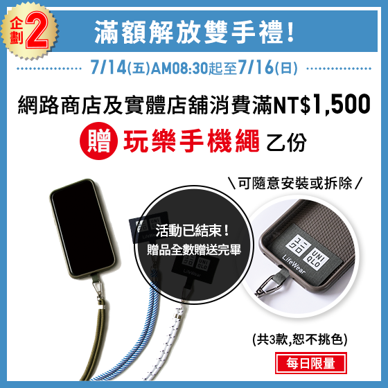 ※網路商店滿額贈送時間於活動第一天 AM08:30起,活動第二天開始自 00:00起贈送,每日數量有限送完為止。※企劃三: 7/21(五)-7/27(四) UNIQLO APP會員滿額抽台灣深度旅遊雙人行程。實體店舖結帳前需掃描UNIQLO APP會員條碼,並限消費前已完成網路商店會員與APP會員綁定者方得參加。得獎名單將於8/24(四)公告在UNIQLO FAQ活動頁面。※其他活動詳情請參UNIQLO網路商店或實體店舖公告。
