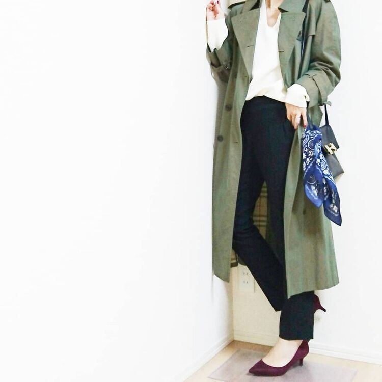 軍綠風衣X黑褲,個性十足。可穿上跟鞋,增添女人味。