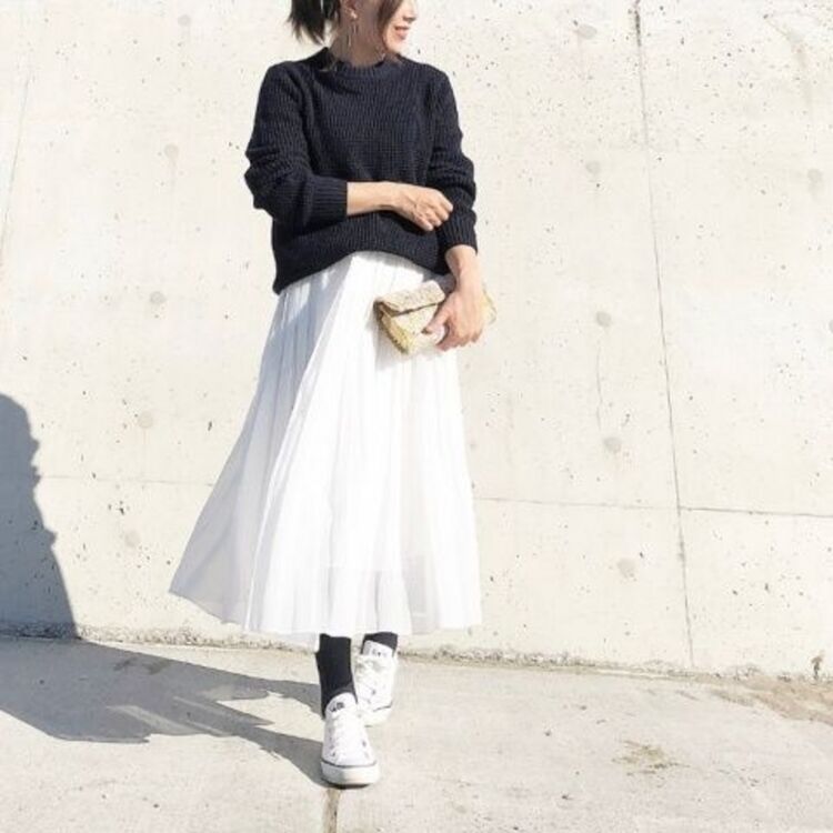 將百褶裙或喇叭裙等甜美裙裝,穿出時尚的成熟女人味就是黑白穿搭術的魅力。不會過於孩子氣的休閒感就是穿搭的重點。