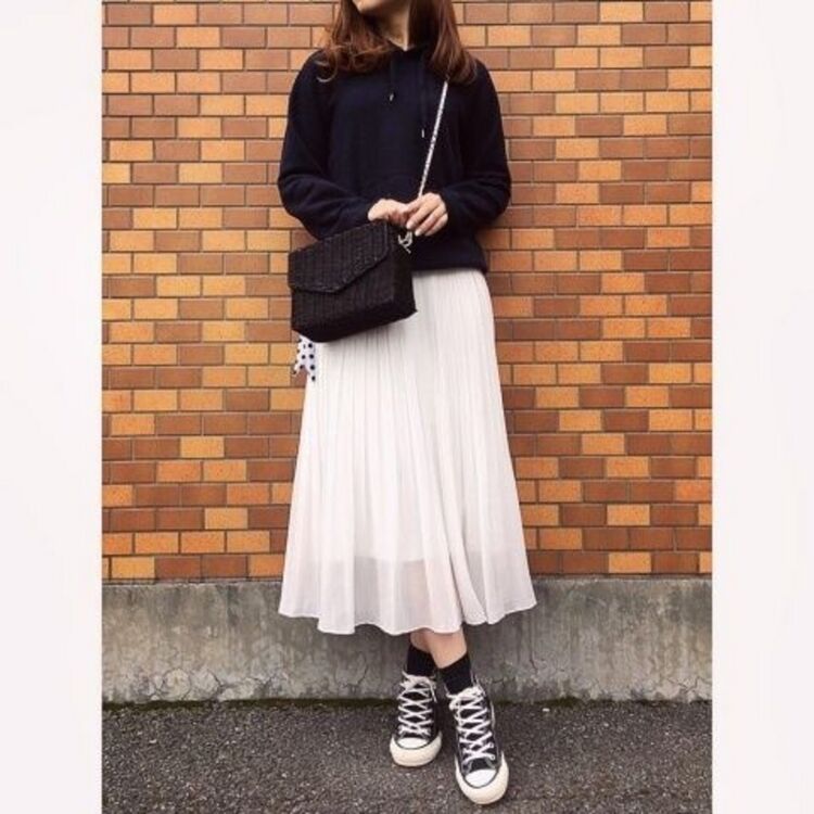 柔和氛圍的百褶裙搭配黑色連帽上衣,更添休閒感。再搭配黑布鞋和襪子,和諧的色調完成整體穿搭造型。