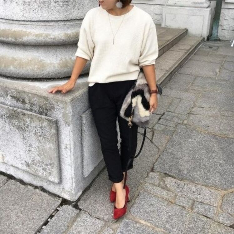 鎖住目光的紅色高跟鞋,此外戴上可以點綴造型的皮草素材耳環和包包,是相當符合季節感又游刄有餘的穿搭造型。