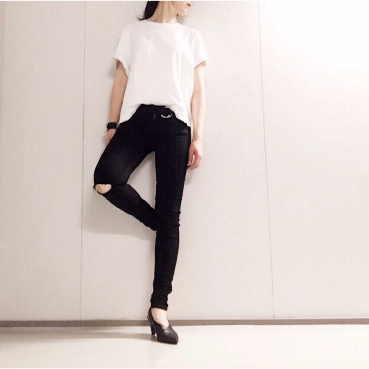 白色T恤加上黑褲的簡約造型,若搭配刷破牛仔褲,馬上提升時尚感。