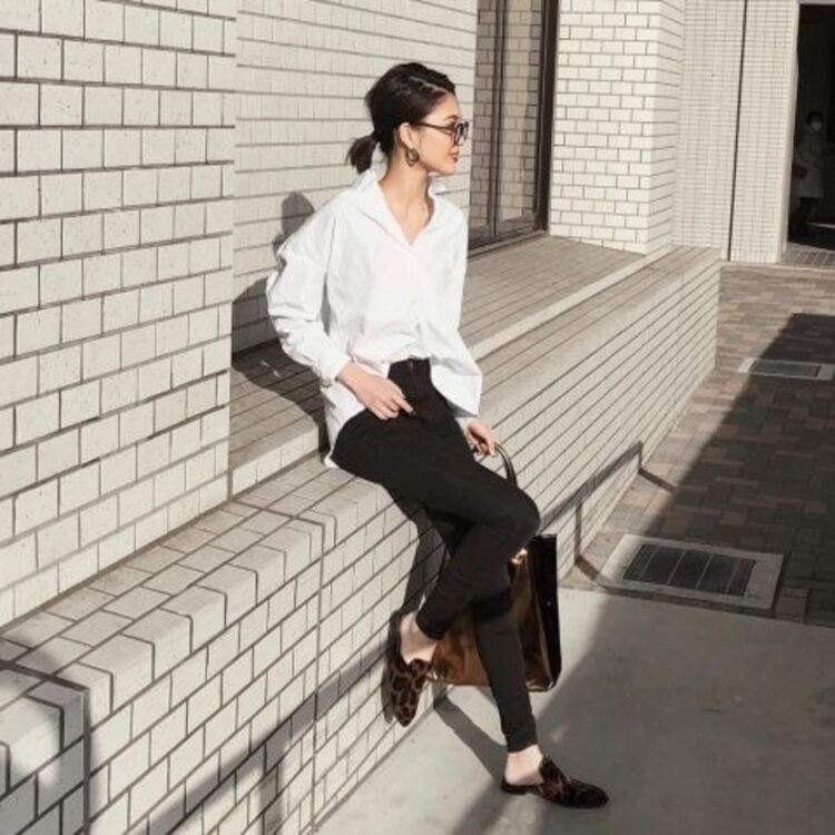 白襯衫×黑褲的百搭造型,以寬大尺寸的襯衫搭配緊身褲裝類,如特級彈性牛仔褲,立即呈現出自在時尚的穿搭好印象。