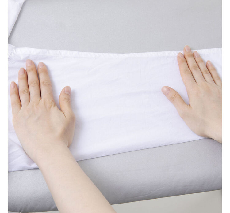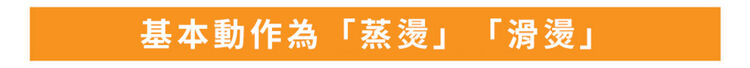 熨燙的基本動作有3個。在已攤平的地方,首先用蒸氣進行「蒸燙」。以熱氣及水份使纖維變軟,便可輕鬆將皺摺熨平。接下來將熨斗在衣物上滑動,進行「滑燙」。此時,需注意蒸氣噴出的時間點。推進時噴出蒸氣,拉回時將蒸氣停止,運用熨板熱氣,可將衣料確實熨壓。巧妙使用蒸氣,確實將皺摺去除吧!
