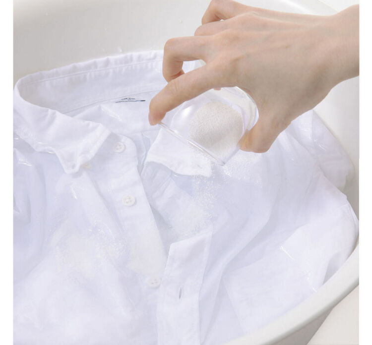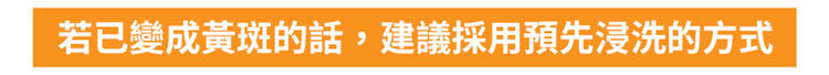 黃斑是因皮脂髒污氧化而形成,一般的洗劑難以去除,因此需進行預先浸洗。所謂的浸洗,就是選用花色衣物也適用的氧系漂白劑。推薦使用粉末劑型,漂白力更高。一般的鹼性產品,洗淨力與漂白力都很高。相較於液體劑型,粉末型產品溶於水後仍能保持高度鹼性,因此若是頑固髒污及黃斑,建議選用粉末型產品。