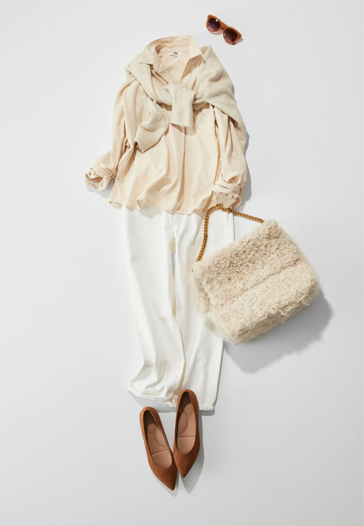 「米杏色的單一色調搭配其實沒有想像中困難,只要能將白色到奶油色之間的色彩作些微的調整搭配就很簡單。例如,以純白的丹寧褲為主軸,加上些微漸層的調色搭配開領襯衫或針織上衣。此時如再以不同質感的單品作搭配,縱使是單一色調穿搭也不會覺得毫無變化。麂皮或人造皮草等,增添不同材質的小配件,時尚感倍增!」