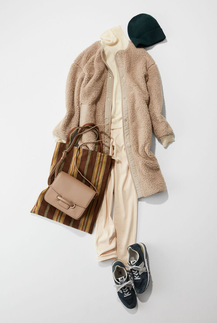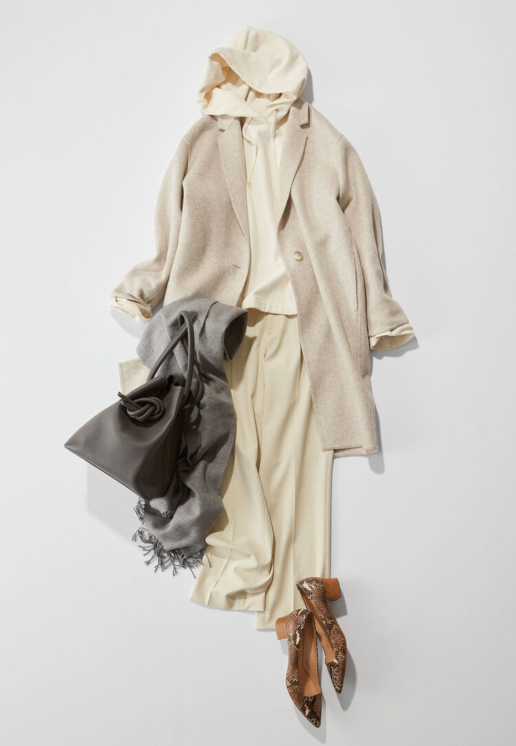 「如果您已經厭倦了冬天穿搭的沉重色系,那麼此時優雅高品味的”米杏色”將會是您最好的選擇。比起單穿,單一色調的搭配才能展現出高級時尚感,請務必要挑戰看看。對於穿著淡色時,對於擔心會過於顯胖的人來說,首要即是以縱長的比例來統整整體穿搭。以針織+緊身褲的顯瘦造型為主軸,再搭配毛絨刷毛外套,就能穿出俐落顯瘦的造型。」