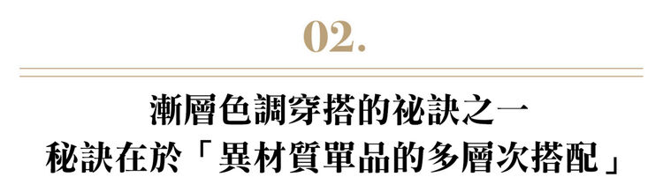 「單一色調穿搭的另一個重點,就是營造出”對比感”。無論是將重點放在素材的對比感,或是色彩濃淡的對比皆可。另一個希望大家銘記在心的訣竅,就是風格MIX的對比方法。例如將清新簡約的褲裝搭配休閒風格的連帽上衣組合,用混搭法簡單營造出造型對比感。不僅展現自然灑脫感,並且讓單一色調穿搭更加搶眼令人印象深刻」