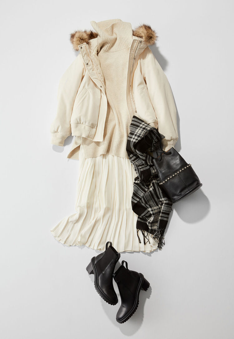 「米杏色對於任何色系的配件都易於搭配,但對於高領針織毛衣搭配細褶長裙的甜美組合,帥氣的黑色配件才是最佳的選擇。提升整體造型,搖身一變為成熟的大人風格。建議可再加上格紋圍巾等花紋單品,添加華麗的氛圍。」