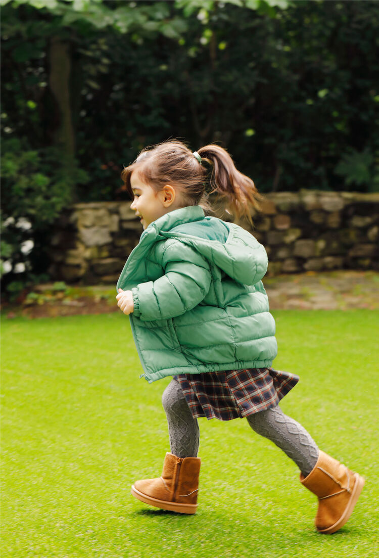 令人驚艷的輕盈保暖單品。將保暖的球狀鋪棉以輕薄的尼龍材質包覆,成為輕巧柔軟的連帽外套。袖口及衣領設有束口造型,能夠阻擋冷風不侵入。頸部、口袋與連帽內側附有柔軟刷毛材質,讓肌膚觸感更加溫暖。可將連帽拆下清洗,建議可用來作為幼兒園上學專用的外套。