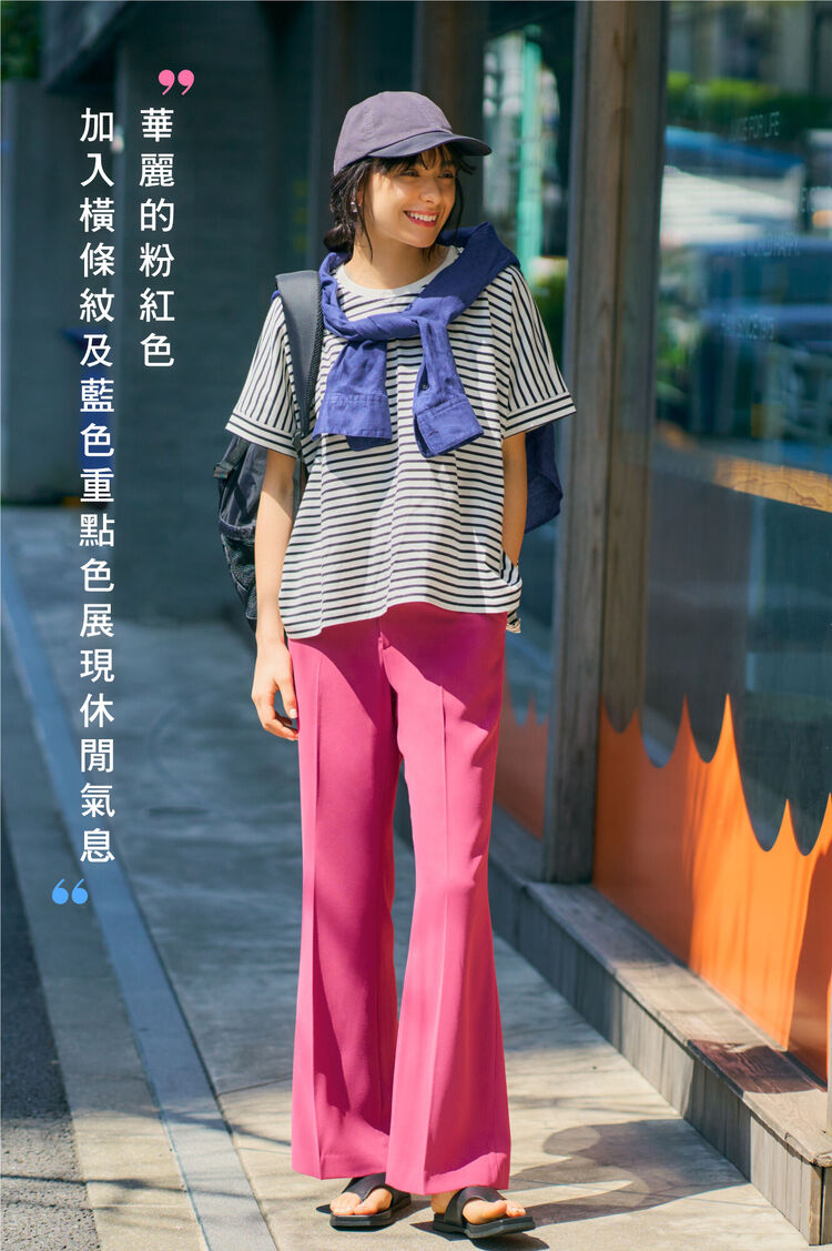 具垂墜感能營造美腿效果的亮眼粉紅長褲,存在感十足相當搶眼。想凸顯其魅力又想打造休閒感,就加入寬版的條紋T恤。以飾品般的感覺加入藍色亞麻襯衫作為重點色,再利用帽子或後背包等配件提升休閒氣息。
