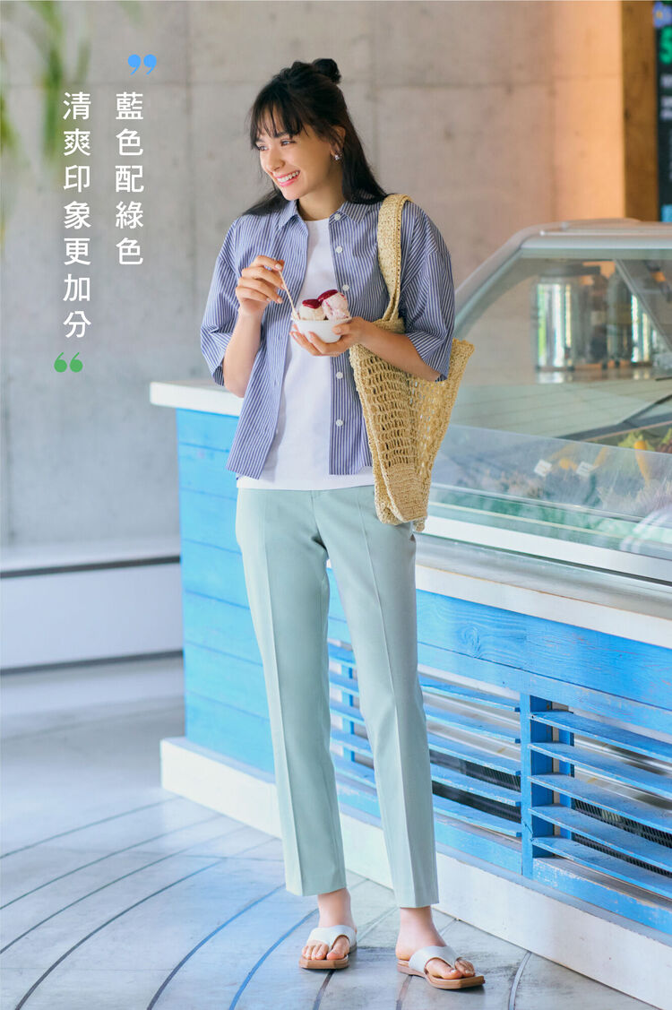 清涼感十足的藍色調綠色九分褲,採用可縱向橫向拉伸的彈性材質製成,且為膝下筆直的錐形版型設計,美腿修飾效果極佳。上衣選擇藍色的直紋襯衫,統一採用涼爽的冷色調,瞬間變得格外時髦。加入白色點綴更不顯單調。