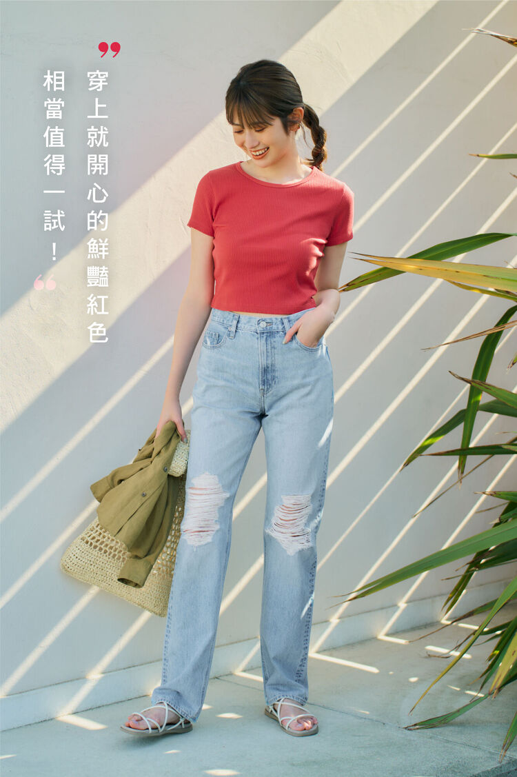 能使心情及氣色都更加明亮的番茄紅色,是夏天的關鍵色系之一。擁有羅紋感的T恤能營造休閒感,搭配破損加工高腰牛仔褲最對味。加入涼鞋或籐編包等夏季小配件,讓整體造型更具隨興性氣息。