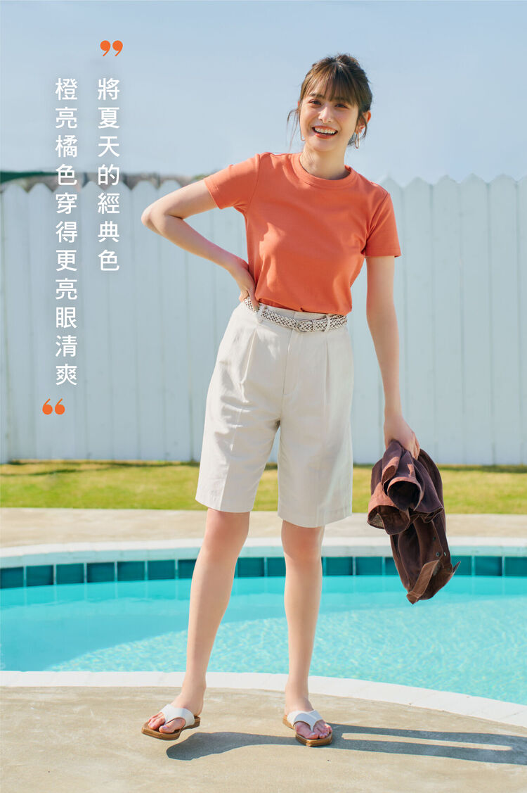 特殊的橘色很能襯托膚色,在流行色中是特別容易嘗試的色系。與混紡亞麻的夏季材質及膝褲搭配穿著,讓橘色更顯沉穩有成熟感。利用涼鞋或腰帶等白色小配件展現不同於往的休閒造型。