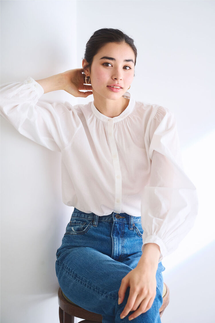 以透膚輕薄棉質打造獨特的蓬鬆輕盈寬袖,與經典的立領設計搭配得恰到好處。利用清爽白色展現俐落成熟的甜美氛圍。除了經典的洗鍊搭配外,選擇高腰寬版窄管牛仔褲之類的時髦褲款打造休閒混搭風格也是新鮮感十足!