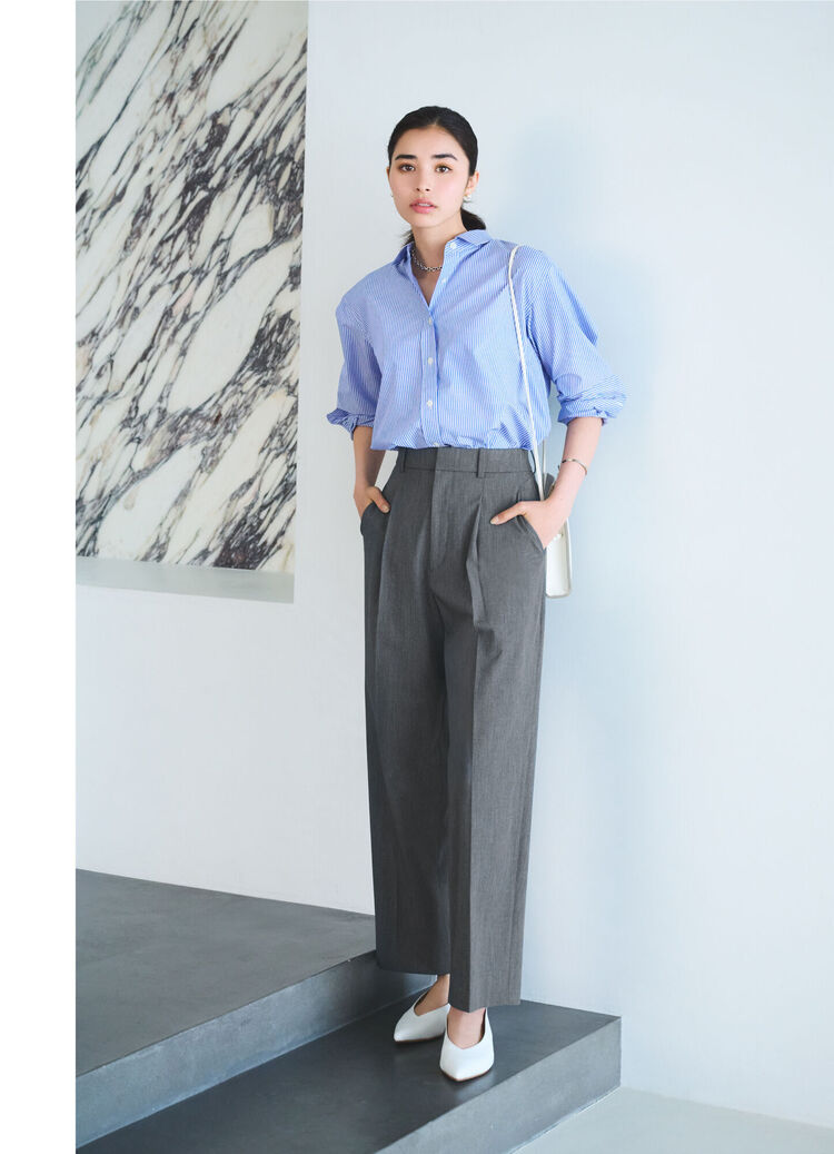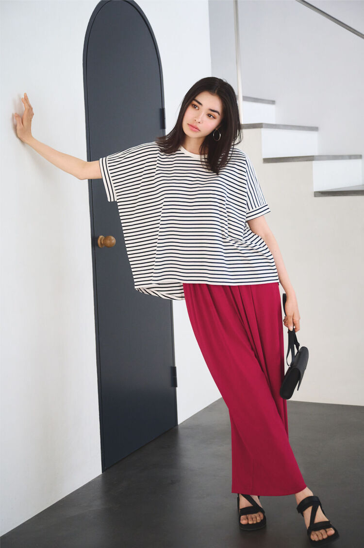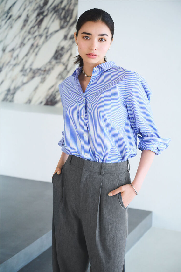 採用具硬挺度的棉質素材,讓洋溢著休閒氛圍的寬版款式化身為洗鍊風格。後方稍長的圓弧衣襬線條使側面及背影也擁有層次變化, 維持360度無死角的優美線條。依照心情或造型稍微將前方衣襬紮入的穿法也很不錯。利用配色手法,與抓皺寬褲搭配的休閒造型一點都不顯得單調。