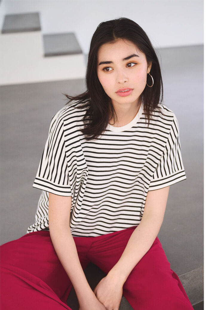 身為休閒單品中最經典的條紋T,在版型跟細節上要更講究,恰到好處的寬鬆度搭配落肩設計營造時髦的隨興氣息。加上衣襬的小小側開衩巧思,打造經典中不顯呆版的時髦氣息。透過這些講究的細節,配合條紋花色打造的綠色調造型顯得相當別緻,下身選擇棉質裙子就能輕鬆打造有型的休閒穿搭。