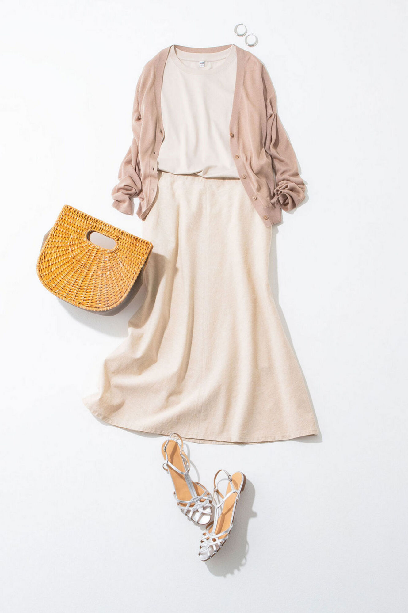 絕妙的米色漸層感的裙裝造型。輕透感的輕薄針織衫搭配棉麻單品…不同材質的搭配可以展現出立體感。