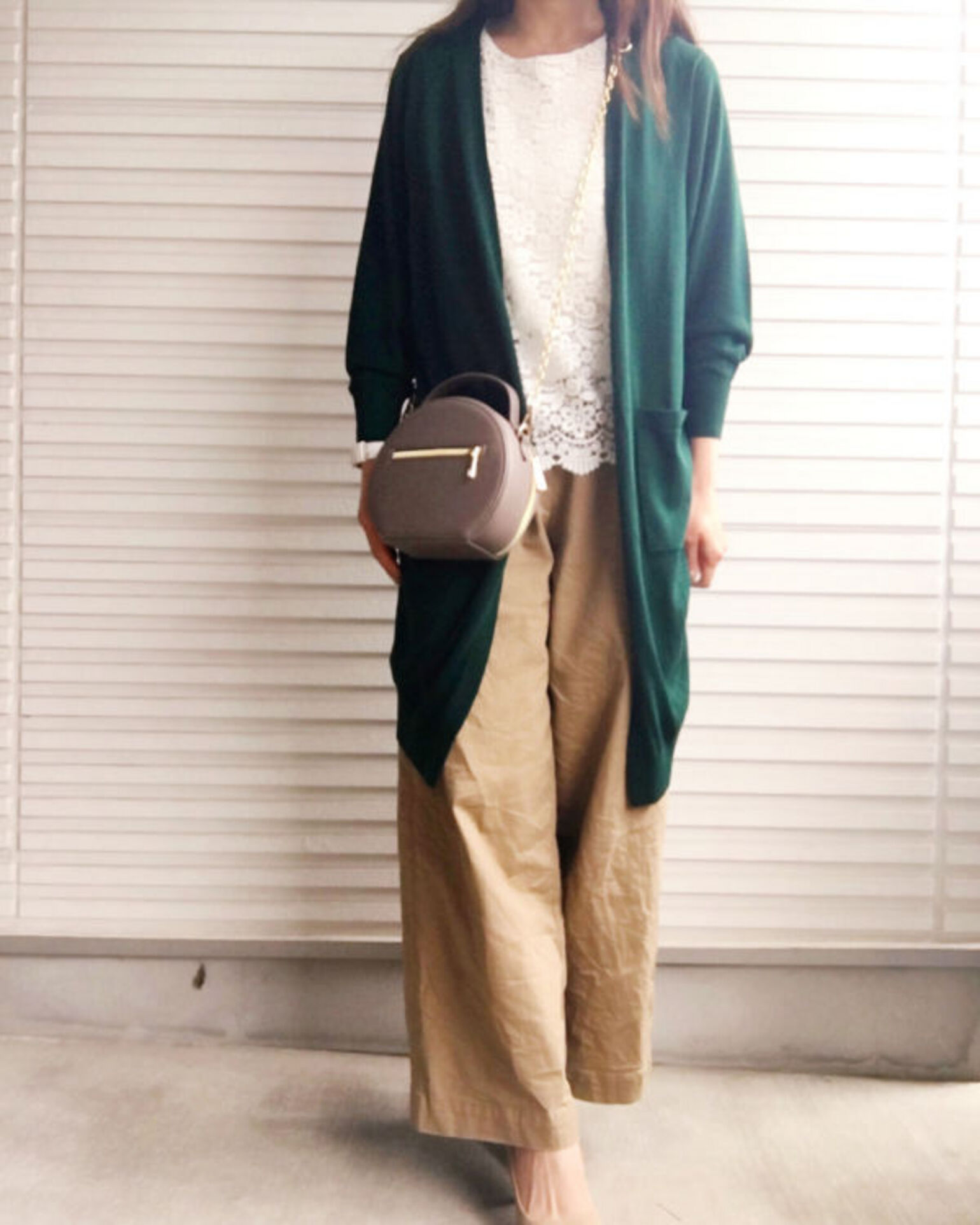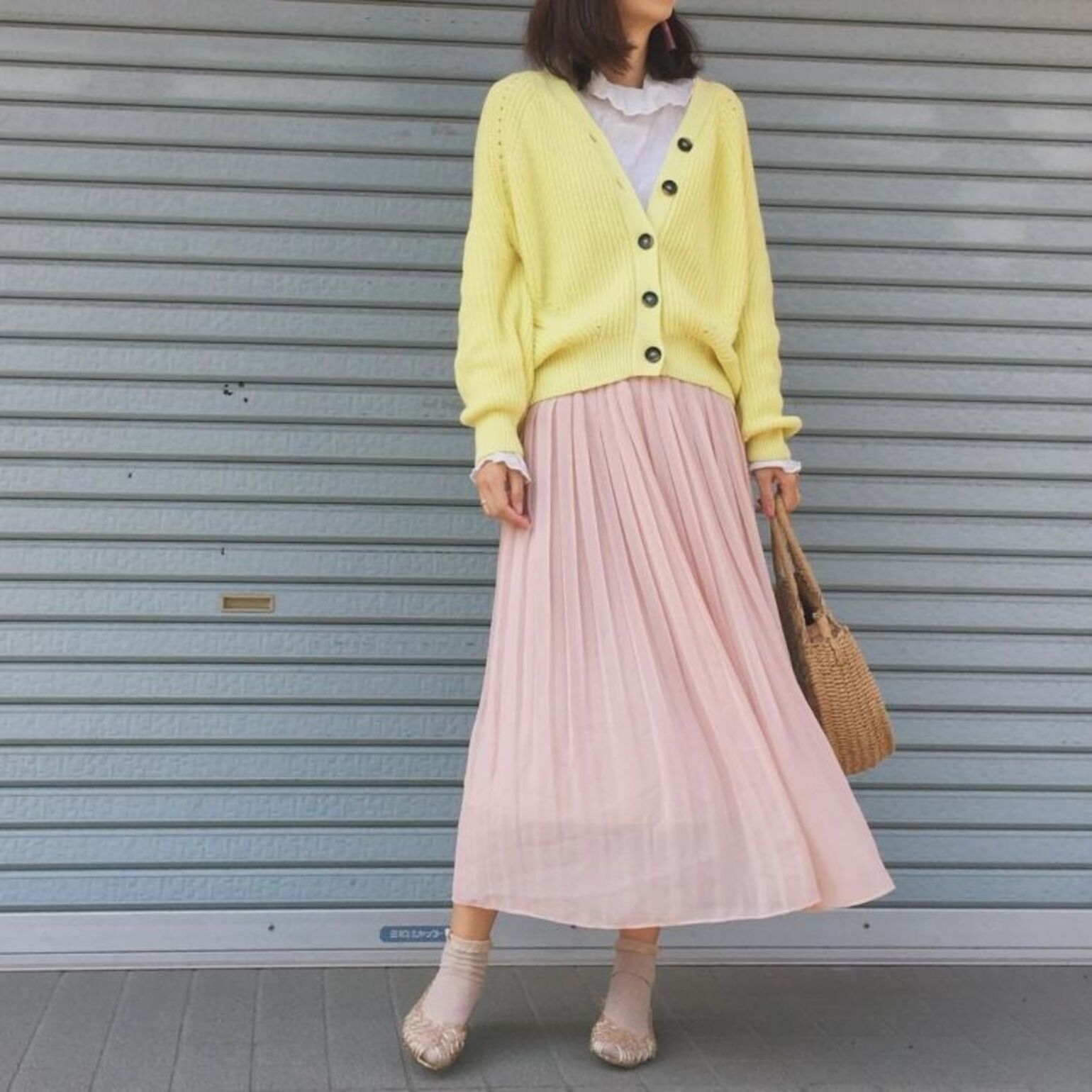 與優美風寬版摺裙搭配,全身整體呈現大A字型線條。打開開襟外套2顆扣子,更能讓肩線看起來纖細。