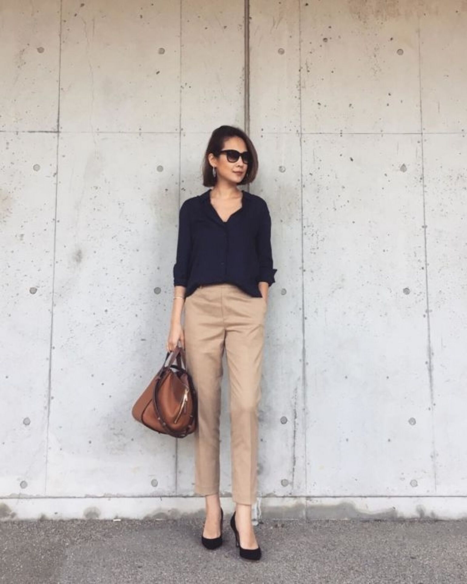 與其穿上高領包覆住頸部,不如以自然感的V領上衣來搭配。可露出鎖骨與胸口肌膚的V領設計,能在整體視覺上有效地修飾肩寬線條。