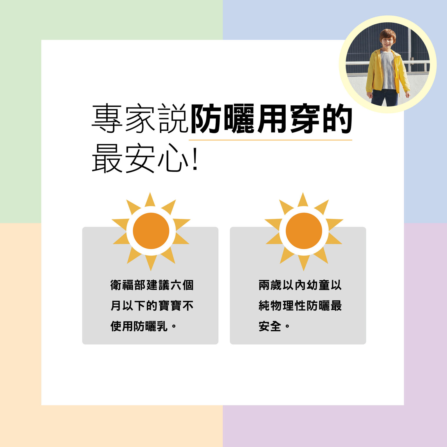 為孩子防曬也更需要當心,防曬乳成份可能較複雜,衛福部建議六個月以下的寶寶避免採用防曬乳,兩歲以內幼童則以純物理性防曬最安全。另外,許多父母經常面臨家中寶貝不願意擦上防曬乳,無法完整防護寶貝肌膚;因此,經過專業認證、標示有防曬係數的「防曬衣」就是對寶貝最安全的防曬方法。
