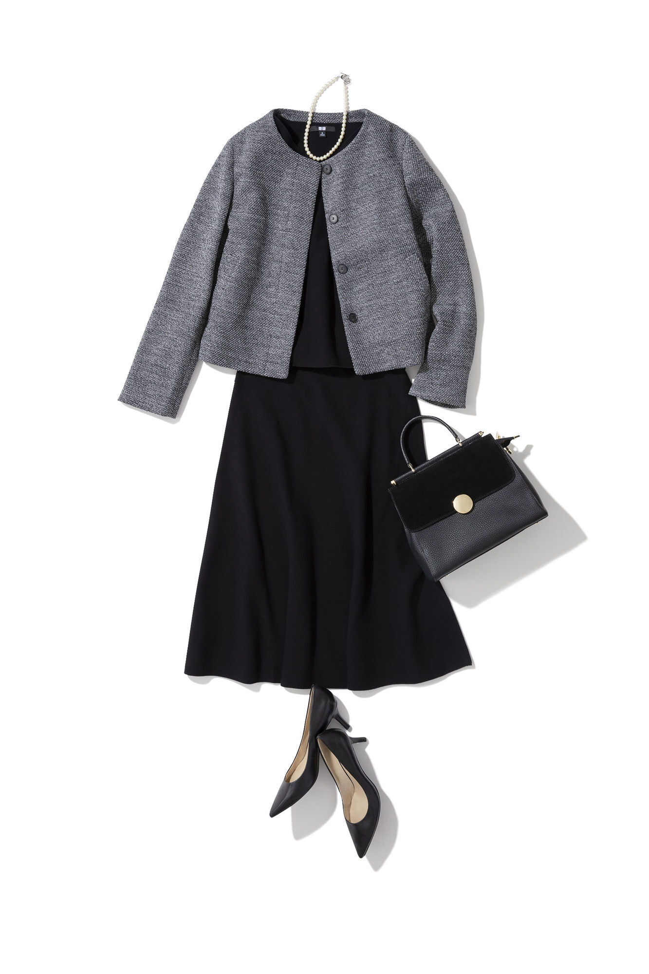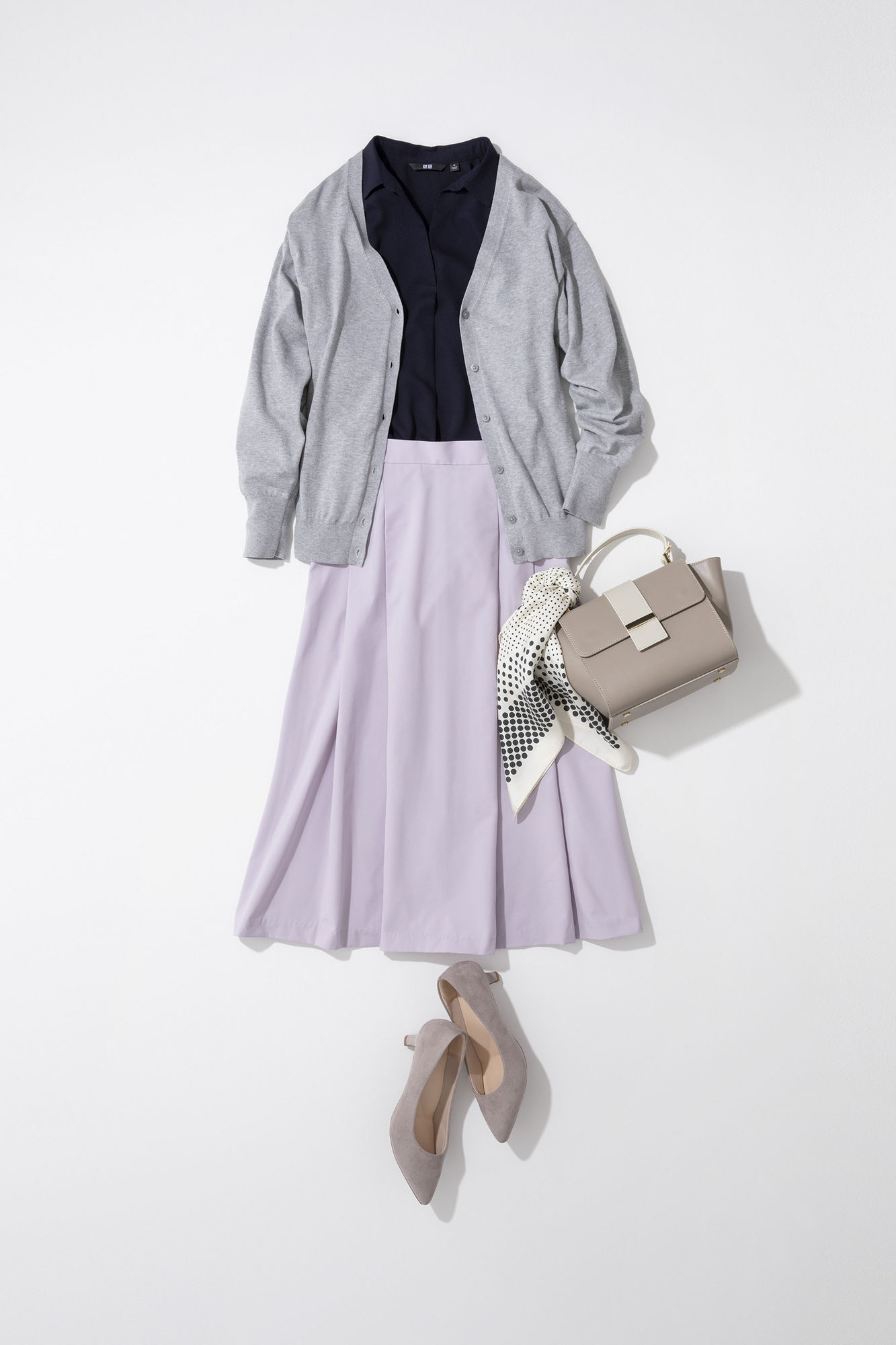 灰色×海軍藍×薰衣草紫的優雅配色,打造小孩眼中的完美媽媽。明亮色的裙裝搭配開領襯衫,加入正式風格元素,除了教學觀摩等學校活動以外也能獲得老師及其他家長的好印象。腳下穿上米色款跟鞋,讓整體造型修身不顯胖。