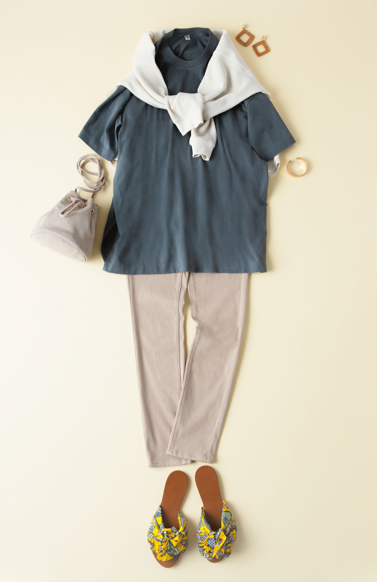 米色系的內搭褲,相較於亮眼色款,搭配大地色等中性色就能散發現行時尚風采。上半身搭配寬鬆長板T恤修飾腹部,整體展現自然森林系的度假風穿搭。