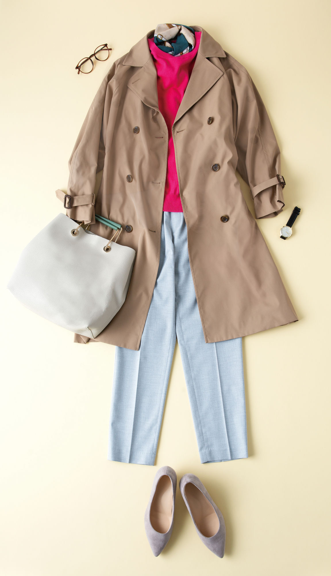 褲管中央壓線設計,職場穿搭也能使用、非常百搭的灰色九分長褲,搭配亮麗春色針織上衣,不論選擇黃色或綠色都十分適合。
