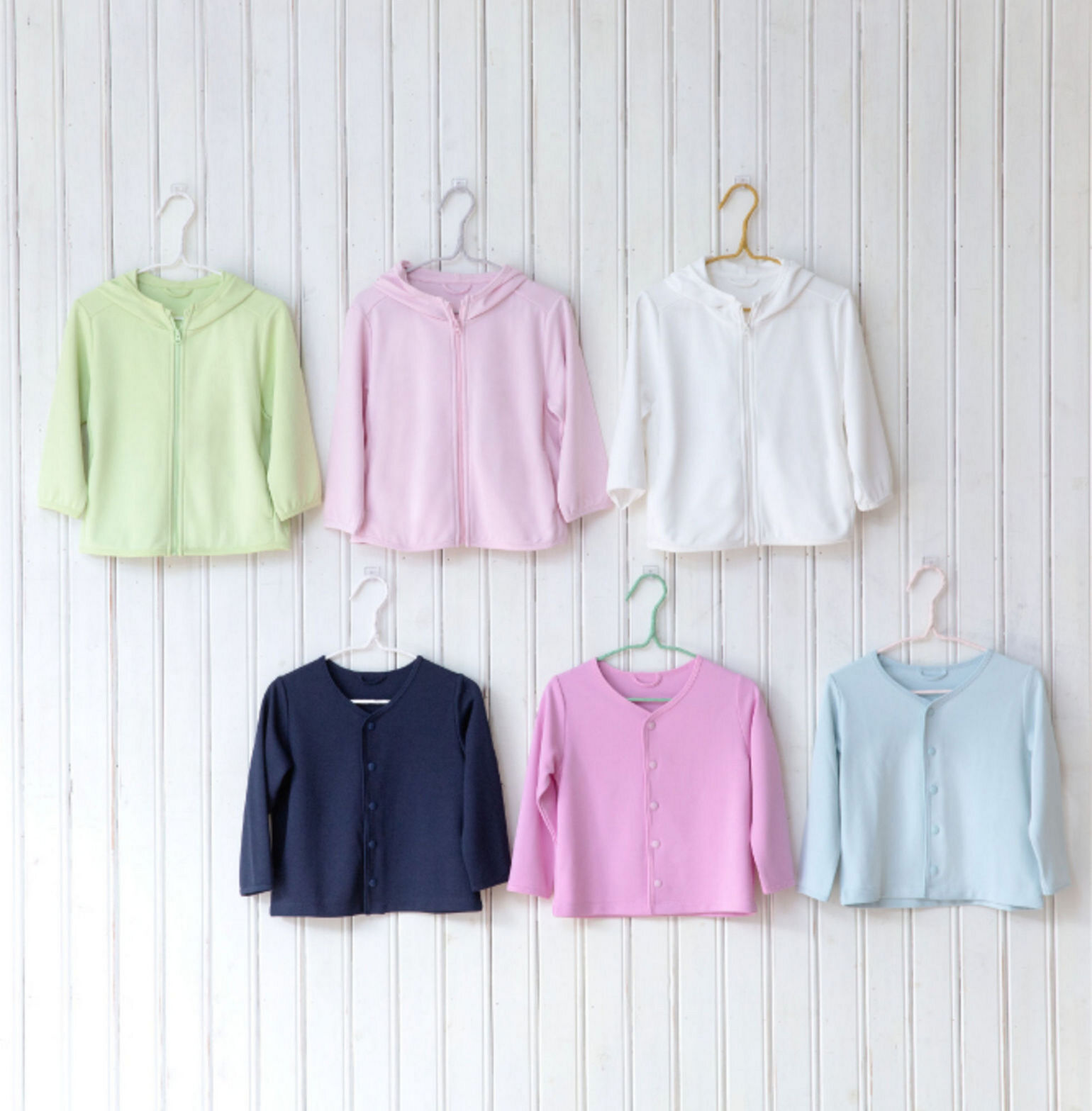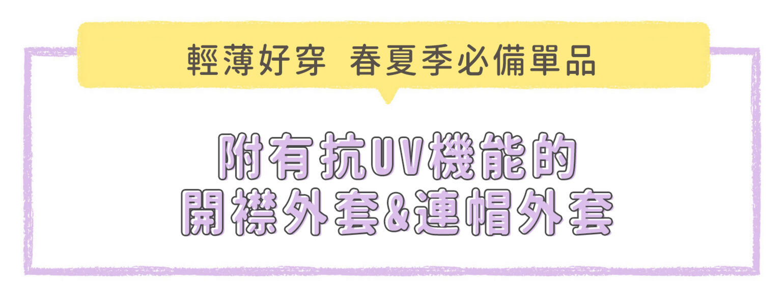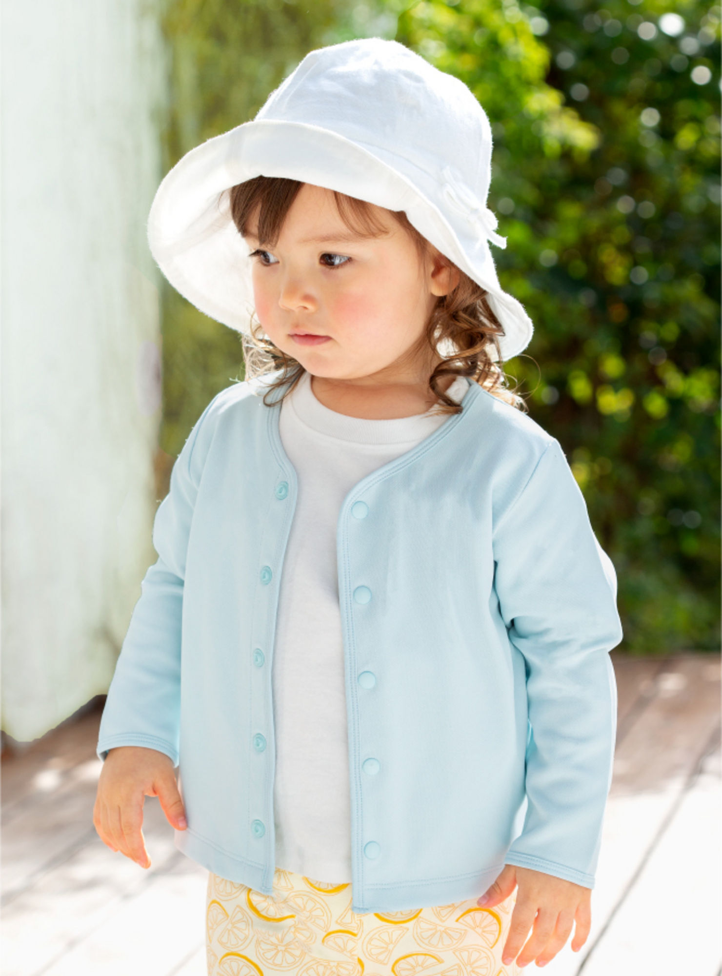 擁有前按釦的開襟外套,在早晚溫差大的季節裡,是調節孩童體溫的便利必備單品。附有抗UV機能,更加提升它的實用性。與帽緣較寬的帽款搭配,打造可愛迷人的抗UV穿搭造型。