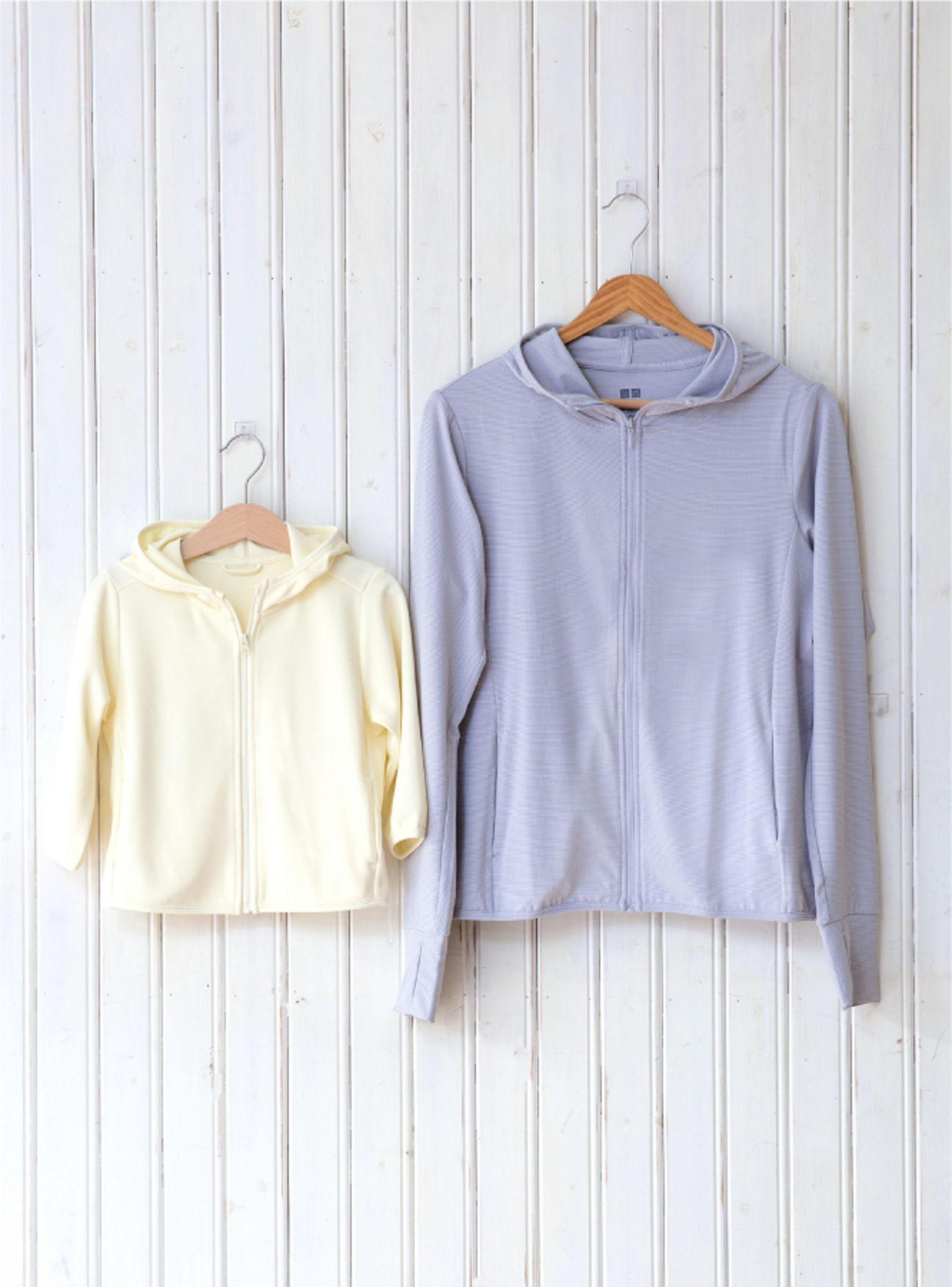 Uniqlo抗UV連帽外套,同時推出大人款式,是款能讓大人小孩穿上相同造型的單品。無論是選用相同或兩種不同的色系,都能享受親子裝穿搭的樂趣,本款也推出種類豐富多樣的色款可供選擇,是充滿人氣的特點之一。