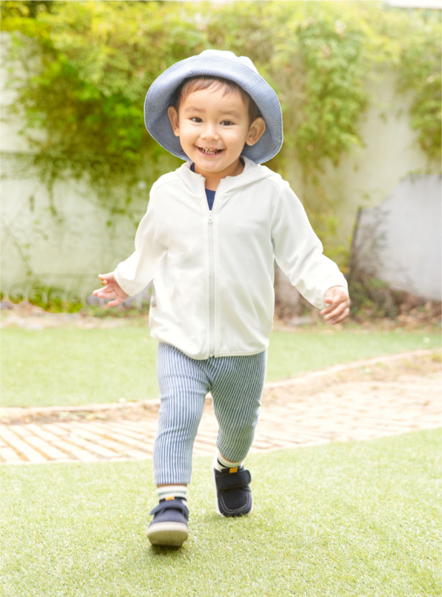 紫外線對策最重要的一點,就是儘量減少露出肌膚的機會。輕薄輕巧的抗UV連帽外套,會是您在今後季節中給寶寶的最佳選擇。速乾機能清洗後也能迅速晾乾,因此可每天穿著,非常實用。