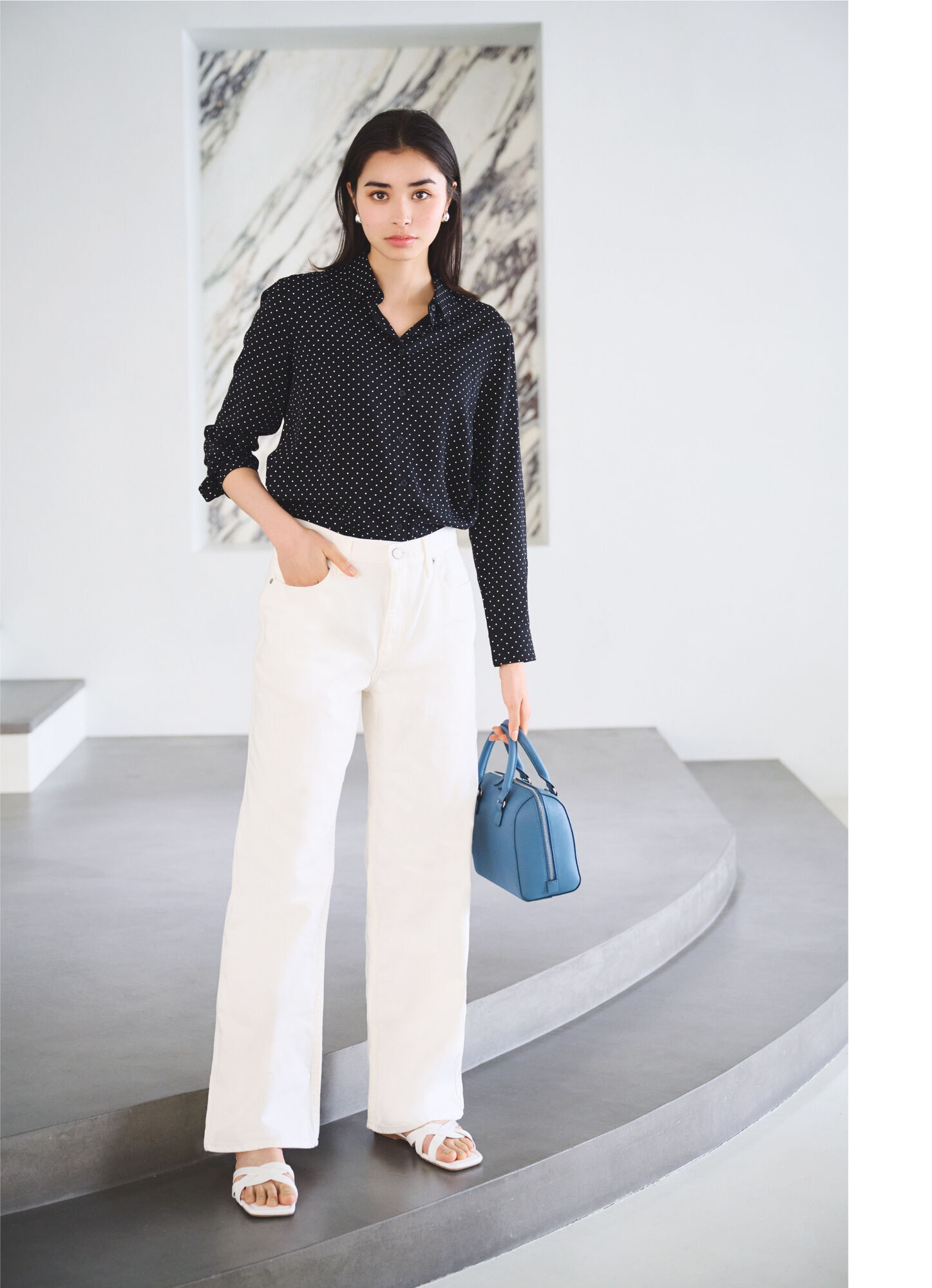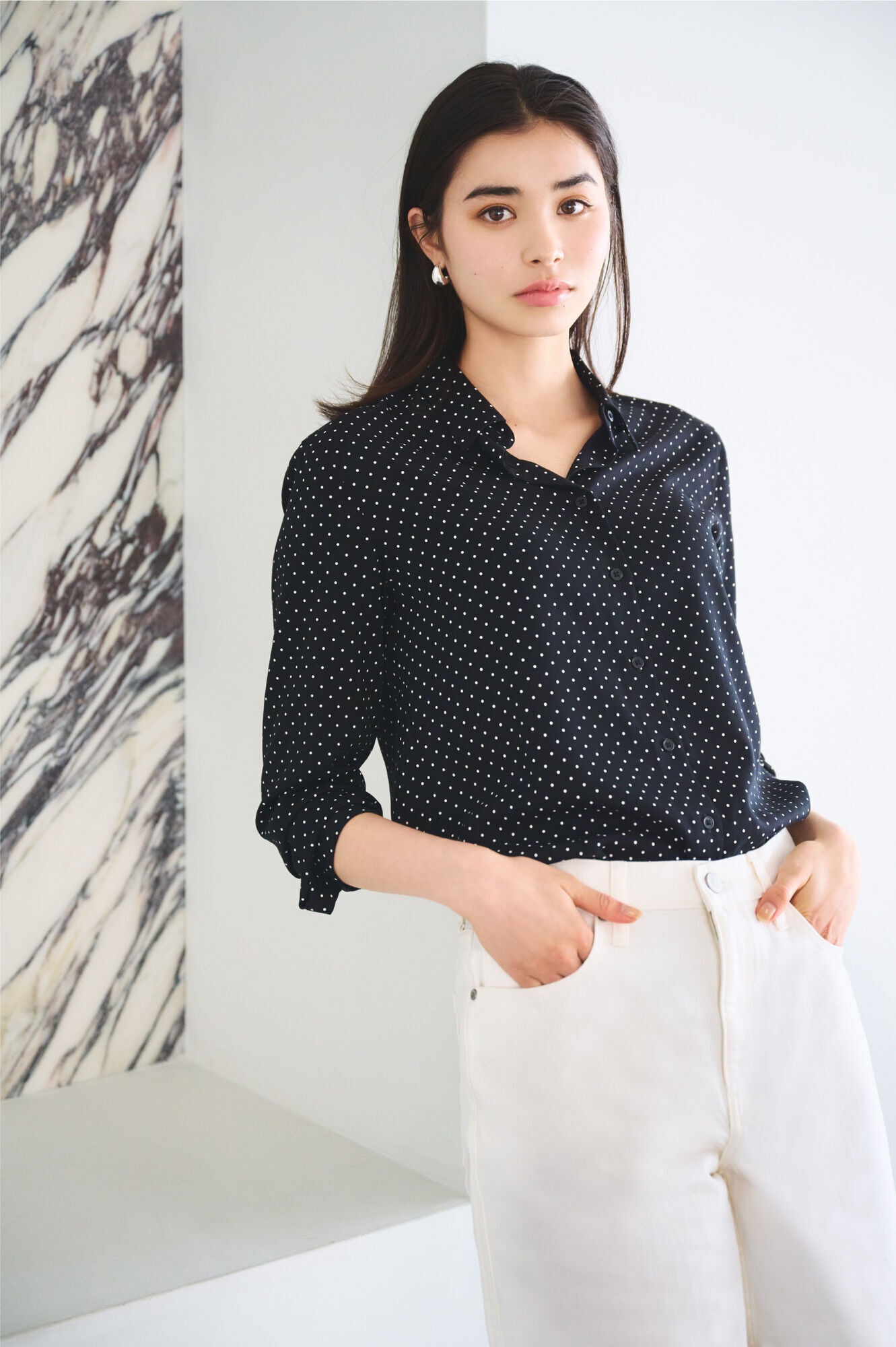 以舒適的細緻材質及恰到好處的寬鬆版型而大受歡迎的高雅細圓點圖案嫘縈印花上衣,再度推出三個季節都可穿著的長袖款。無論紮上衣的正式穿法或放出衣襬的休閒搭配法都很好看,作為外套也沒問題。進入秋季後也可以外搭寬鬆休閒上衣或針織上衣來打造層次穿搭。