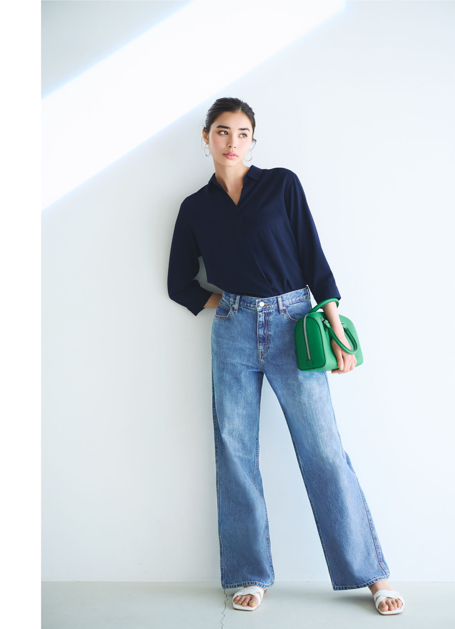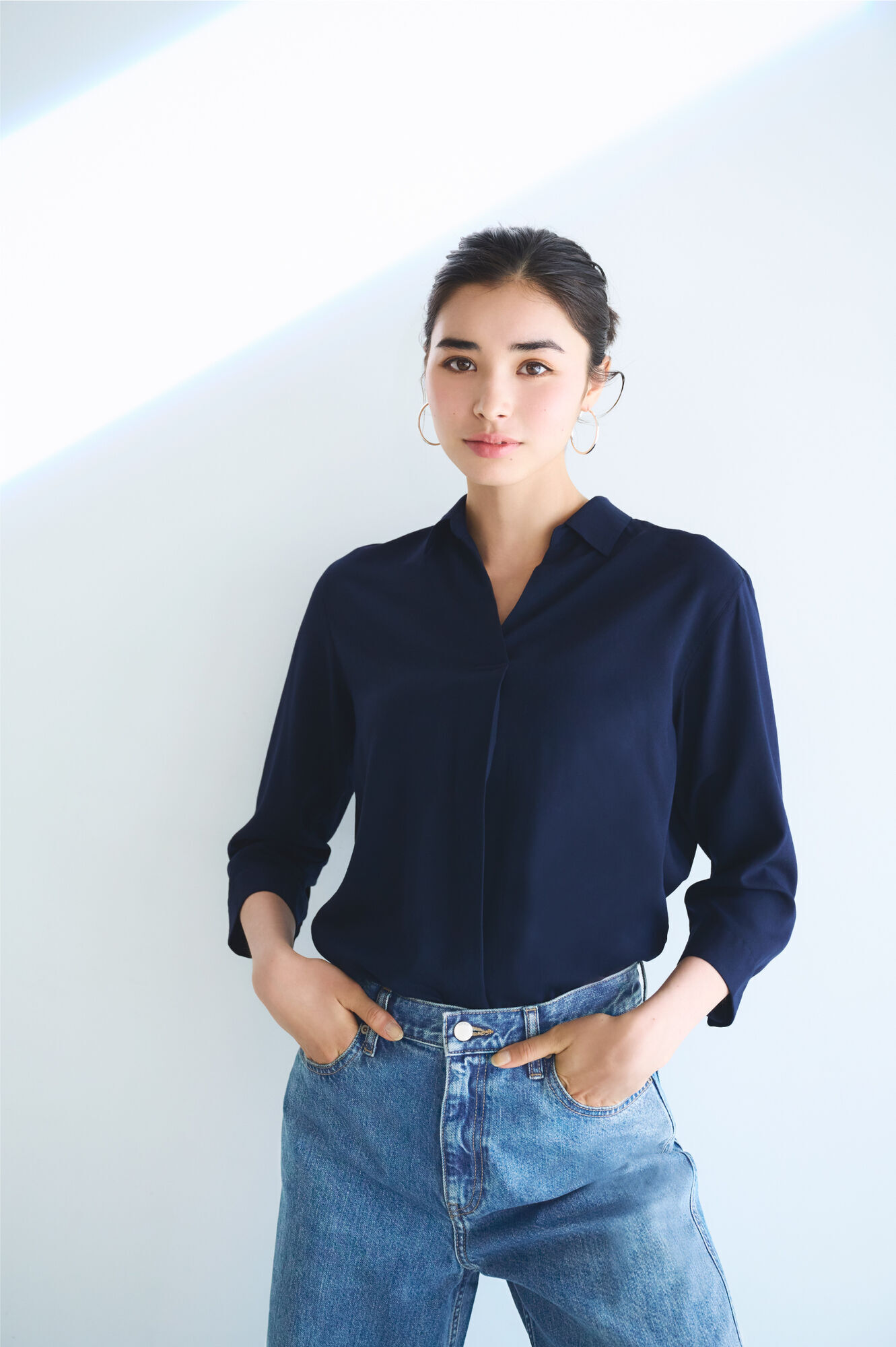 不易起皺,擁有絲滑柔順親膚感的嫘縈開領上衣,是許多消費者包色購買的經典人氣款,其中四季適穿的深藍色更是絕不出錯的必備單品。除了洗鍊造型外,也能搭配這種時髦的寬版牛仔褲款營造休閒感。穿上就充滿隨興感的七分袖設計也是一大亮點。