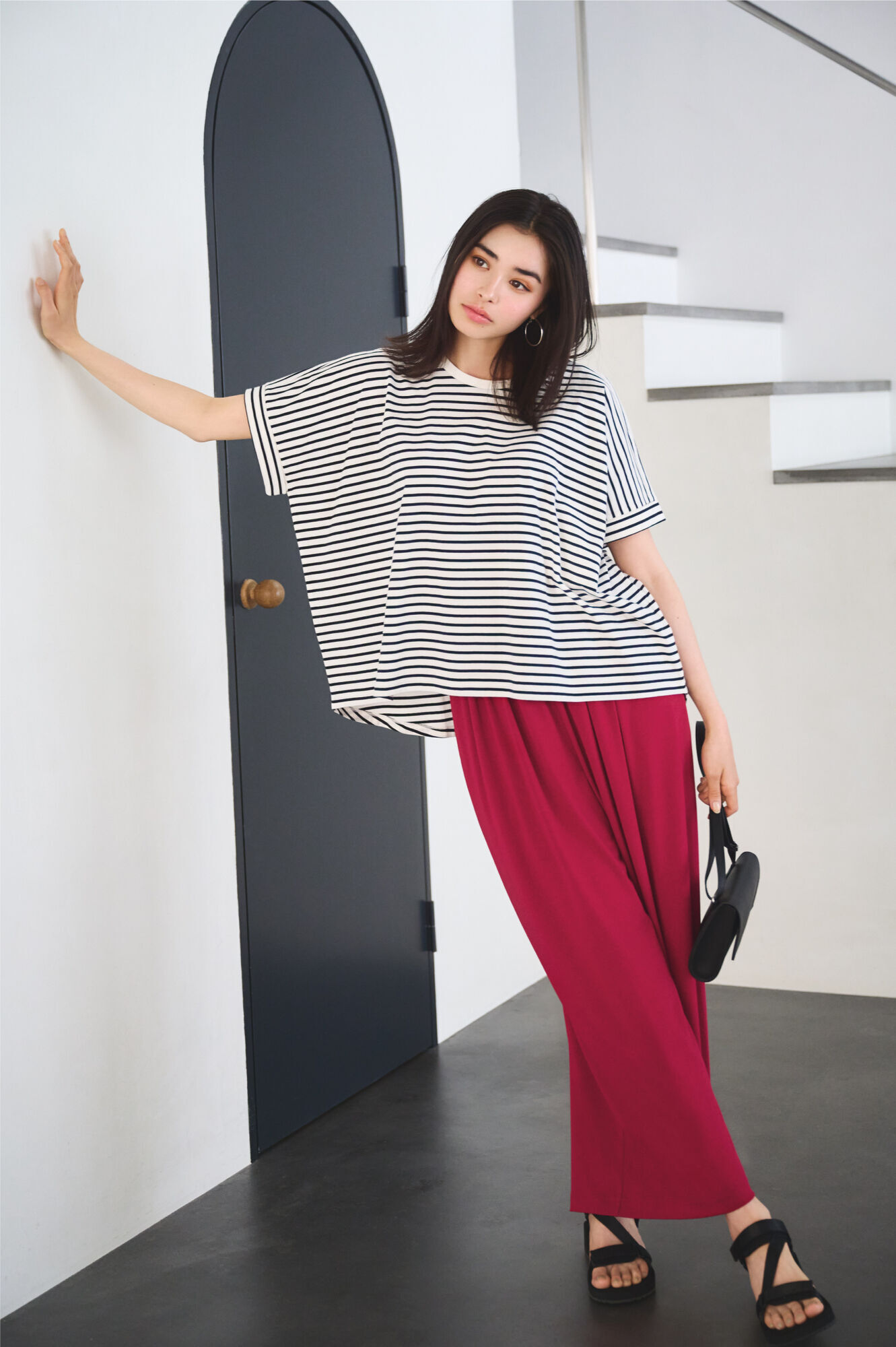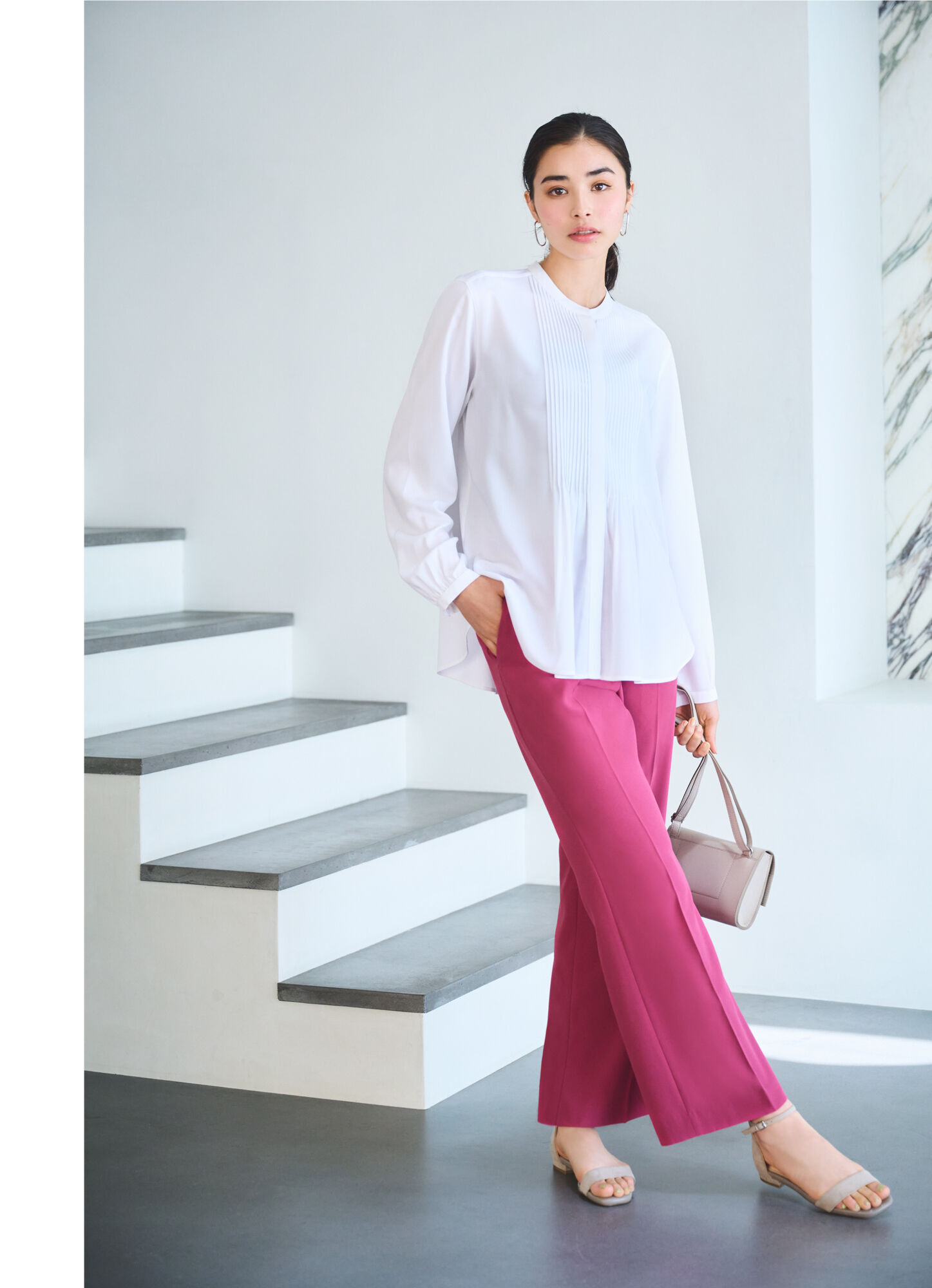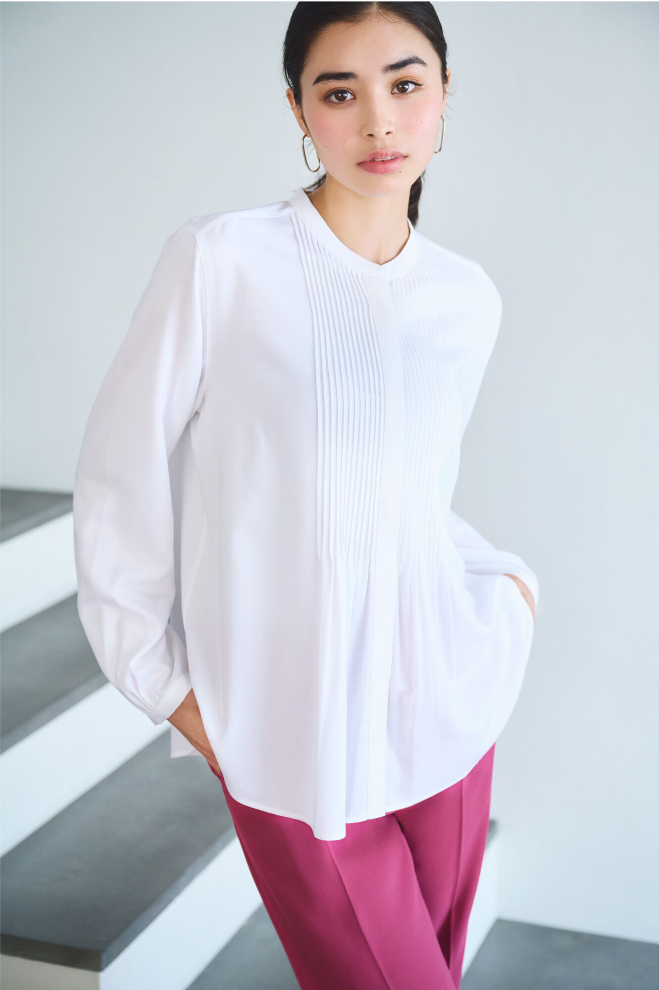 高雅的無領設計加上壓褶細節,凸顯嫘縈材質獨有的絲滑柔順質感。搭配質感極佳的搶眼粉紅色時髦寬襬褲,更增添優雅的復古氣息。此外搭配牛仔褲或窄裙也很適合。精心計算的衣長即使不紮上衣也能擁有視覺平衡感,是與任何下半身單品都好搭的萬用單品!