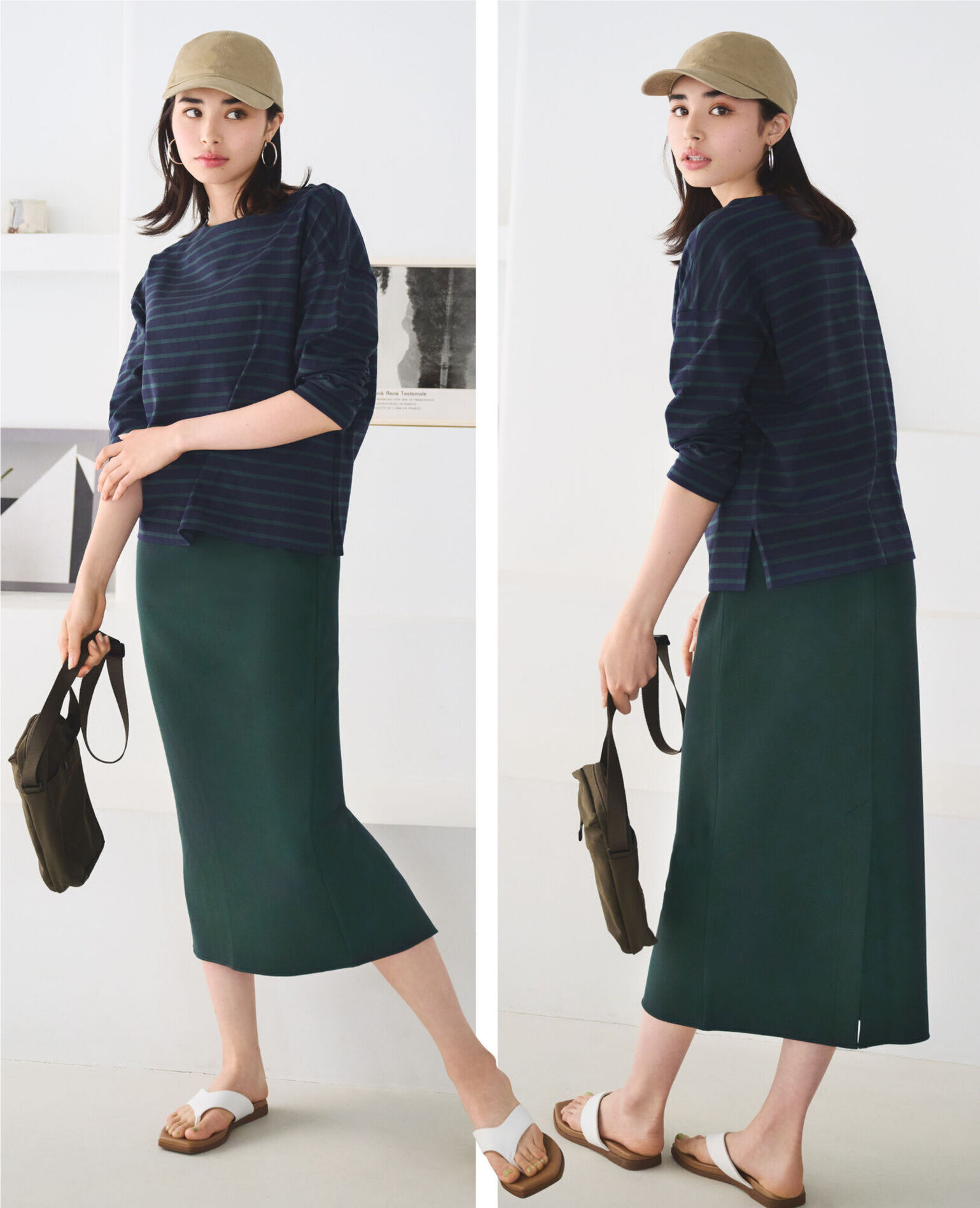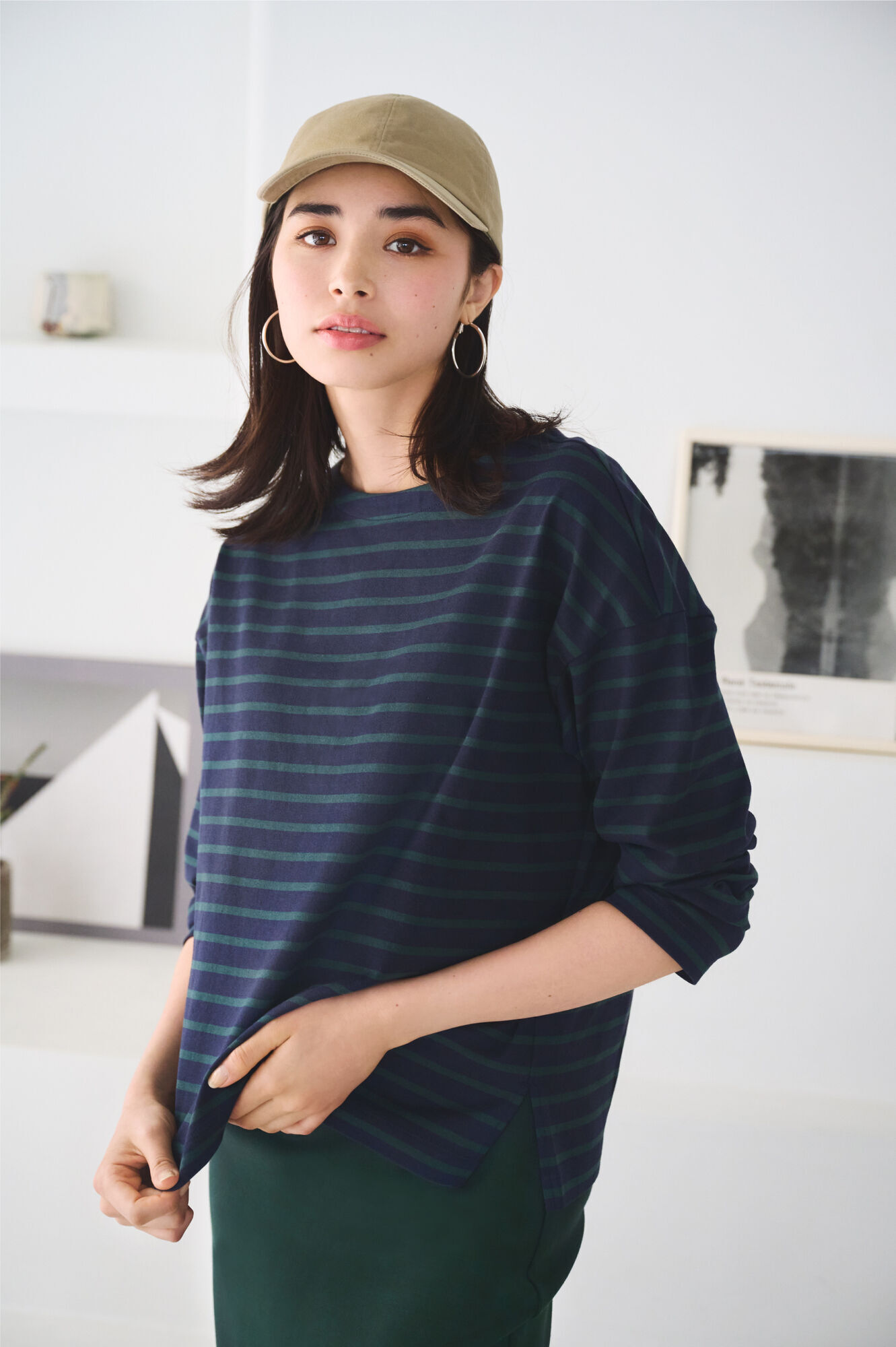 身為休閒單品中最經典的條紋T,在版型跟細節上要更講究,恰到好處的寬鬆度搭配落肩設計營造時髦的隨興氣息。加上衣襬的小小側開衩巧思,打造經典中不顯呆版的時髦氣息。透過這些講究的細節,配合條紋花色打造的綠色調造型顯得相當別緻,下身選擇棉質裙子就能輕鬆打造有型的休閒穿搭。