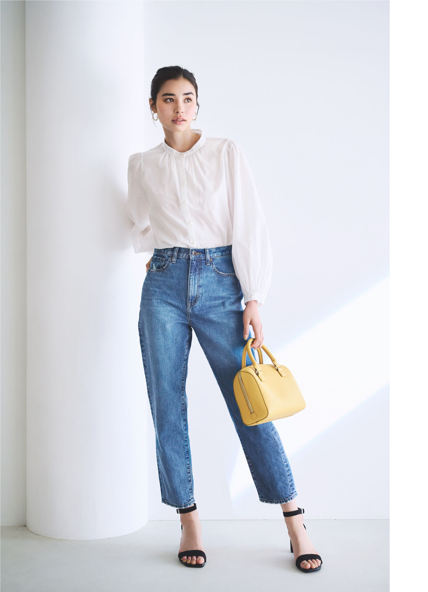 以透膚輕薄棉質打造獨特的蓬鬆輕盈寬袖,與經典的立領設計搭配得恰到好處。利用清爽白色展現俐落成熟的甜美氛圍。除了經典的洗鍊搭配外,選擇高腰寬版窄管牛仔褲之類的時髦褲款打造休閒混搭風格也是新鮮感十足!