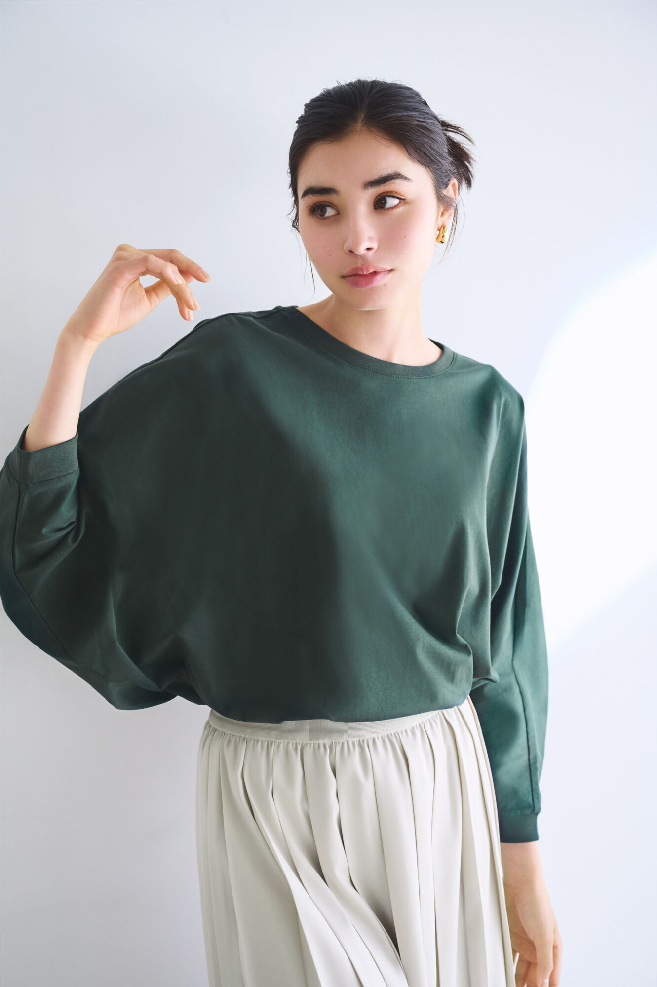 寬鬆版型加上變化感的連袖設計,選用品味十足的雅緻綠色,打造單穿就很有型的長袖T恤。乍看是休閒感單品,搭配百褶裙等甜美系單品也毫不違和。採用四季都適穿的棉質素材,夏天可將袖子捲起營造隨興感,初秋放下袖子則顯得俐落又大方運用能透過不同的穿法或搭配方式,成為跨季時尚單品。