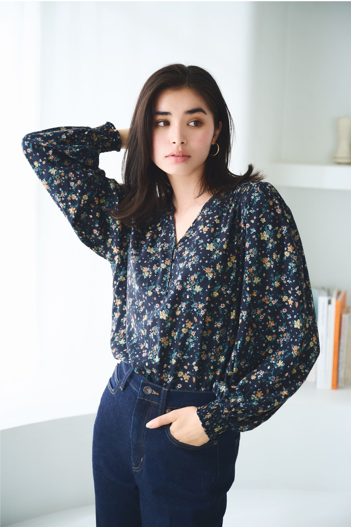 以暗色為底,低調的法式雅緻印花設計十分有新鮮感!俐落的V領加上甜美的外觀,展現低調性感的成熟氣息。寬鬆的蓬袖設計凸顯變化感,同時又於袖口加入鬆緊抽褶,兼具實用性讓衣著更加分。不易皺的特性不只適合日常穿著,也推薦旅行攜帶。