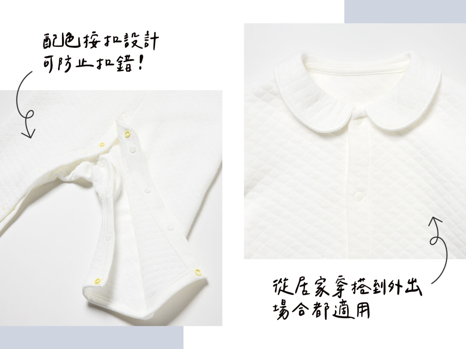 有了 UNIQLO BABY系列,跟「咦?扣錯釦子了!」說掰掰!部分釦子採用顏色標示,大大減少扣錯的機率,讓爸媽不再手忙腳亂。而且只需要輕輕一壓,釦子就能「啪嗒」地輕鬆扣上或打開,操作手感非常順暢。