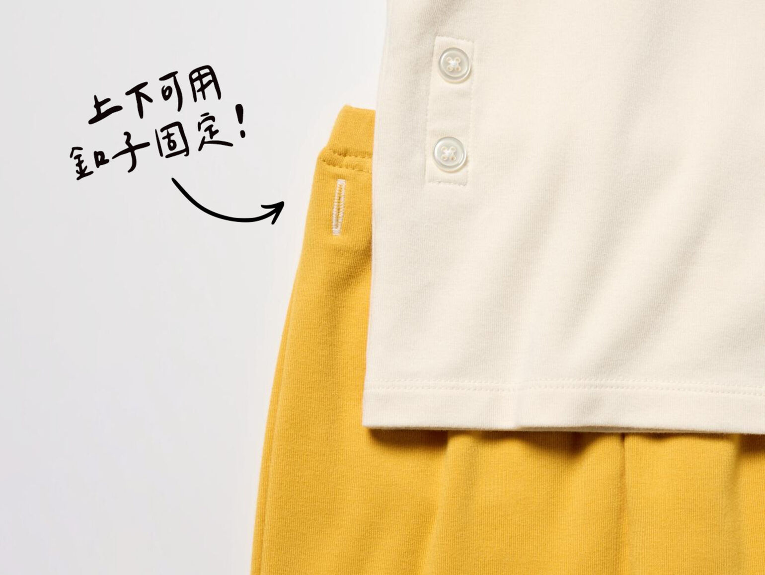在領口、胯下中央與褲腳的釦子,內側特別標示為黃色,幫助爸媽辨識釦位,避免扣錯;另外,釦子材質選用塑膠材質,減少對金屬過敏發生的可能性※,搭配獨家設計的「輕鬆啪嗒感」,從研發階段就精心打造。