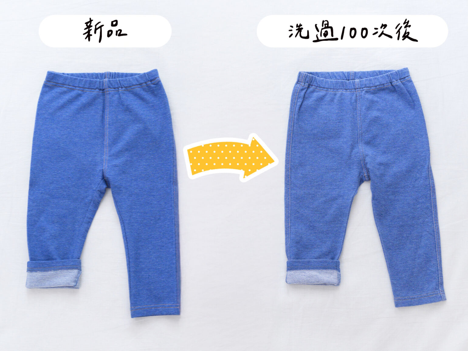 左邊是全新,右邊是同一款內搭褲經過洗滌100次後的樣子。可以清楚看到幾乎沒有變形,維持良好版型。仔細看右側雖然略有褪色,但整體幾乎感覺不。這樣的對比,更能證明 UNIQLO BABY 內搭褲的耐穿程度。