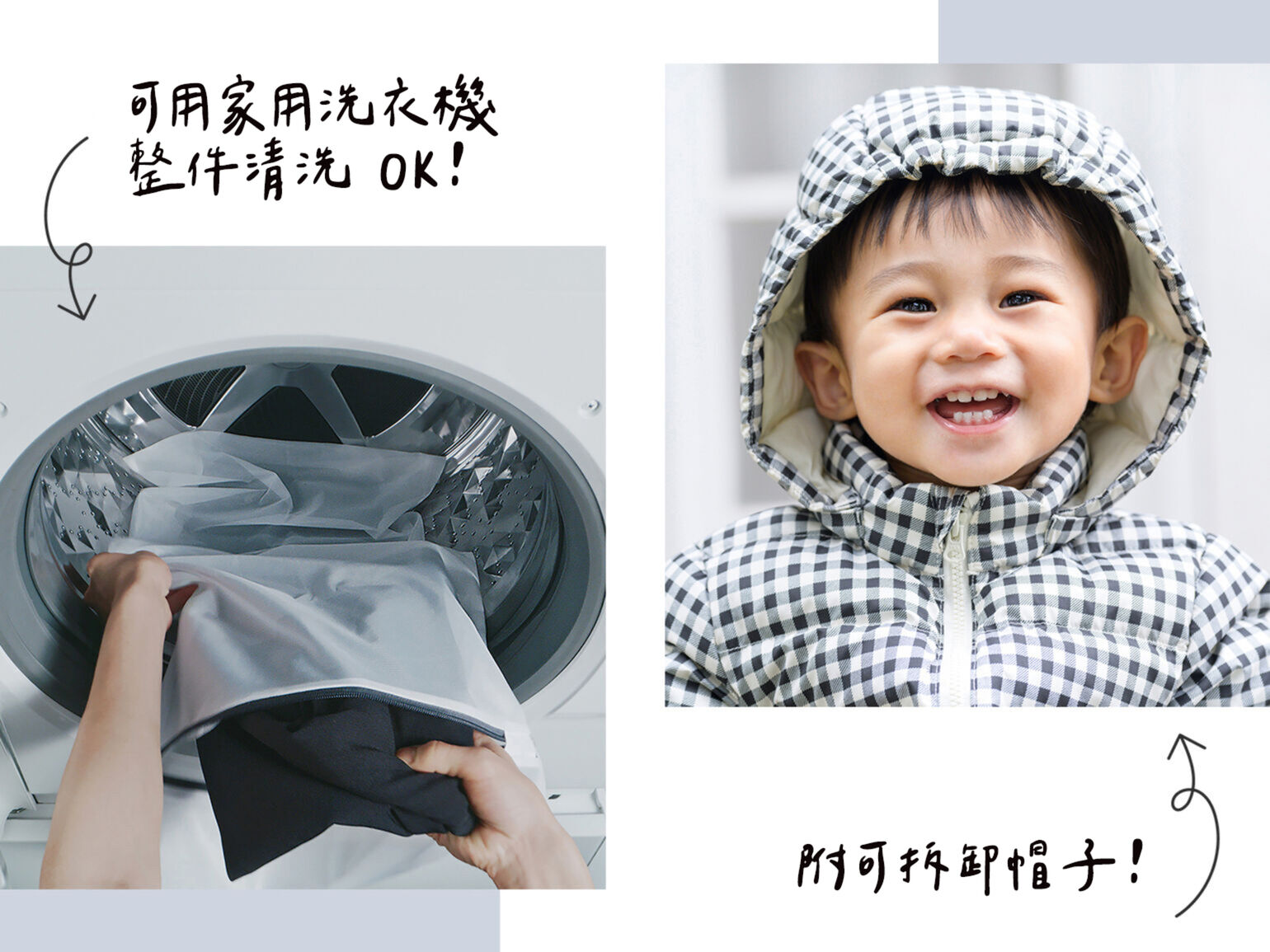 就算弄髒了也能輕鬆在家機洗,PUFFTECH外套為可機洗設計,愛用者更大讚:「怎麼洗都不容易變形」、「孩子玩得全身是泥,丟洗衣機後還是蓬鬆柔軟」等等,好評不斷!外套的帽子還能依情況拆卸,平日上保育園時拆掉,假日出門則保留帽子,穿搭更有彈性。