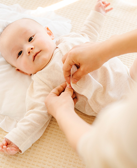 嬰兒常常會因為換衣服的方法及姿勢不對而哇哇大哭, 有著不會讓嬰兒產生壓力的寬袖子,能在嬰兒睡著時快速更衣的前開設計。